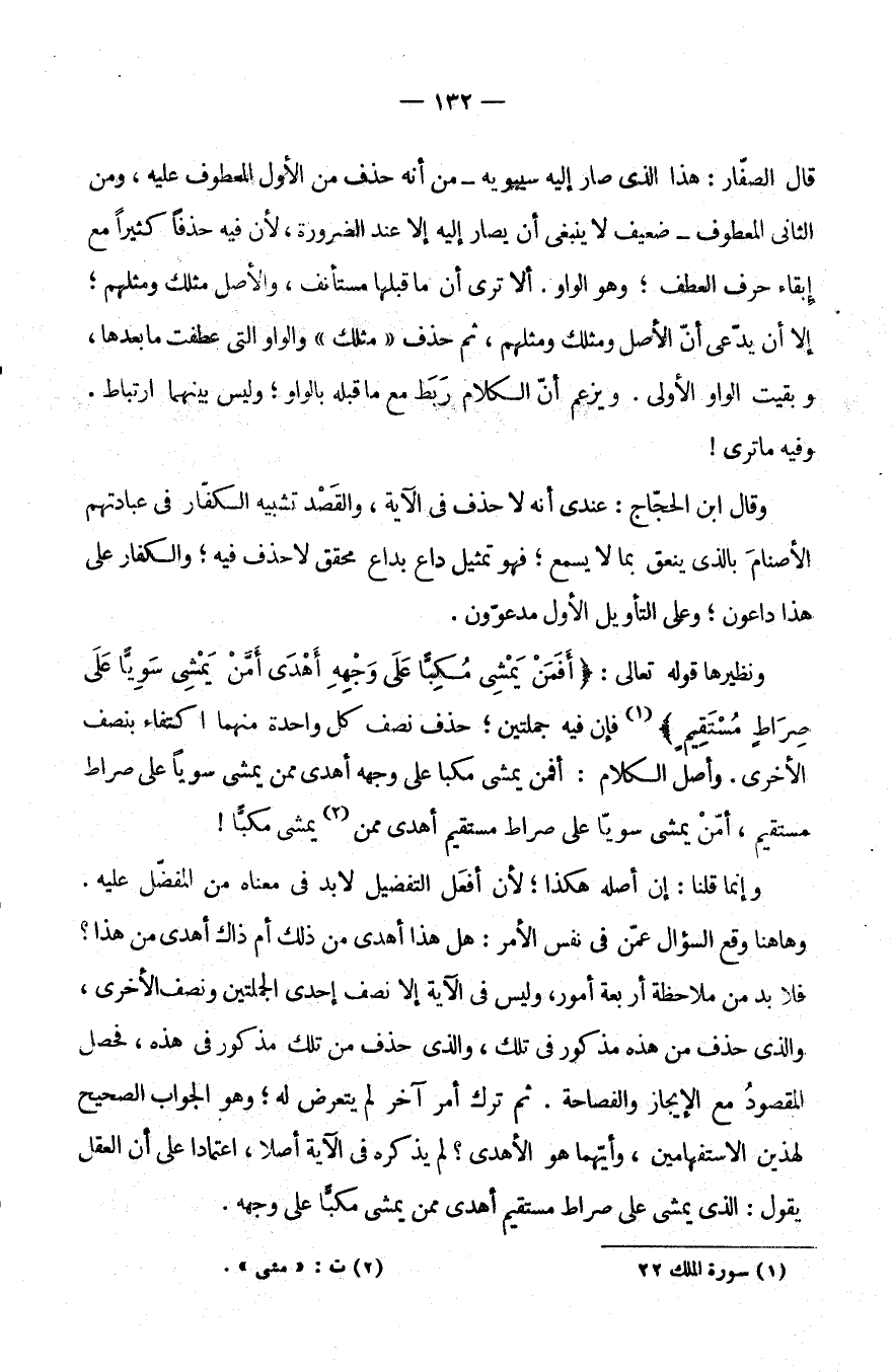 وَهَاهُنَا وَقَعَ السُّؤَالُ عَمَّنْ فِي نَفْسِ الْأَمْرِ هَلْ هَذَا أَهْدَى مِنْ ذَلِكَ أَمْ ذَاكَ أَهْدَى مِنْ هَذَا؟ فَلَا بُدَّ مِنْ مُلَاحَظَةِ أَرْبَعَةِ أُمُورٍ وَلَيْسَ فِي الْآيَةِ إِلَّا نِصْفُ إِحْدَى الْجُمْلَتَيْنِ وَنِصْفُ الْأُخْرَى وَالَّذِي حُذِفَ مِنْ هَذِهِ مَذْكُورٌ فِي تِلْكَ وَالَّذِي حُذِفَ مِنْ تِلْكَ مَذْكُورٌ فِي هَذِهِ فَحَصَلَ الْمَقْصُودُ مَعَ الْإِيجَازِ وَالْفَصَاحَةِ ثُمَّ تُرِكَ أَمْرٌ آخَرُ لَمْ يُتَعَرَّضْ لَهُ وَهُوَ الْجَوَابُ الصَّحِيحُ لِهَذَيْنِ الِاسْتِفْهَامَيْنِ وَأَيُّهُمَا هُوَ الْأَهْدَى لَمْ يَذْكُرْهُ فِي الْآيَةِ أَصْلًا اعْتِمَادًا عَلَى أَنَّ الْعَقْلَ يَقُولُ الَّذِي يَمْشِي عَلَى صِرَاطٍ مُسْتَقِيمٍ أَهْدَى مِمَّنْ يَمْشِي مُكِبًّا عَلَى وَجْهِهِ.