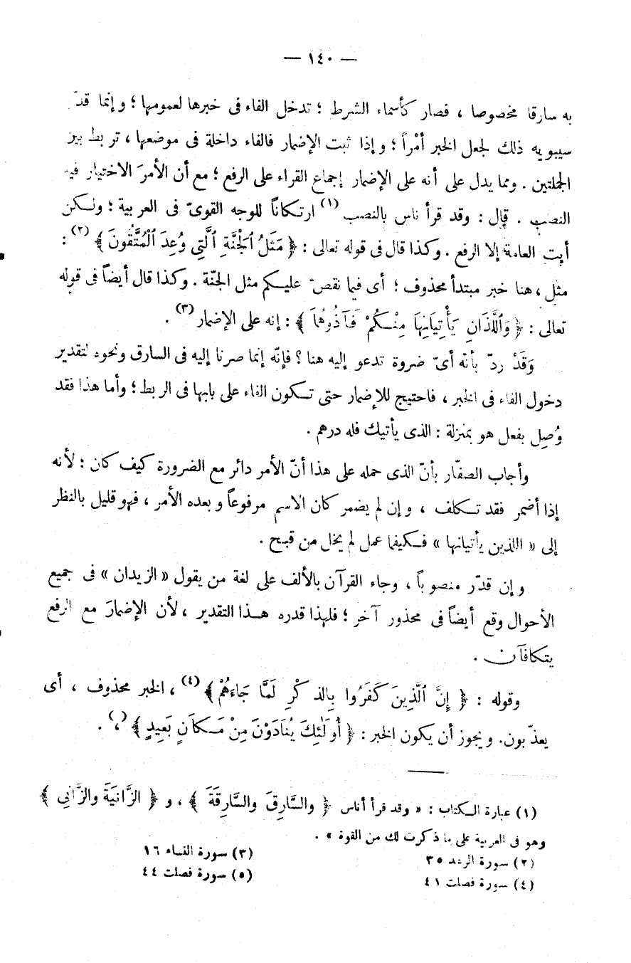 بِهِ سَارِقًا مَخْصُوصًا فَصَارَ كَأَسْمَاءِ الشَّرْطِ تَدْخُلُ الْفَاءُ فِي خَبَرِهَا لِعُمُومِهَا وَإِنَّمَا قَدَّرَ سِيبَوَيْهِ ذَلِكَ لِجَعْلِ الْخَبَرِ أَمْرًا وَإِذَا ثَبَتَ الْإِضْمَارُ فَالْفَاءُ دَاخِلَةٌ فِي مَوْضِعِهَا تَرْبُطُ بَيْنَ الْجُمْلَتَيْنِ وَمِمَّا يَدُلُّ عَلَى أَنَّهُ عَلَى الْإِضْمَارِ إِجْمَاعُ الْقُرَّاءِ عَلَى الرَّفْعِ مَعَ أَنَّ الْأَمْرَ الِاخْتِيَارِيَّ فِيهِ النَّصْبُ قَالَ وَقَدْ قَرَأَ نَاسٌ بِالنَّصْبِ ارْتِكَانًا لِلْوَجْهِ الْقَوِيِّ فِي الْعَرَبِيَّةِ وَلَكِنْ أَبَتِ الْعَامَّةُ إِلَّا الرَّفْعَ. وَكَذَا قَالَ فِي قَوْلِهِ تعالى: {مثل الجنة التي وعد المتقون} : مَثَلُ، هُنَا خَبَرُ مُبْتَدَأٍ مَحْذُوفٍ أَيْ فِيمَا نقض عَلَيْكُمْ مَثَلُ الْجَنَّةِ وَكَذَا قَالَ أَيْضًا فِي قوله تعالى: {والذان يأتيانها منكم فآذوهما} : إِنَّهُ عَلَى الْإِضْمَارِ.