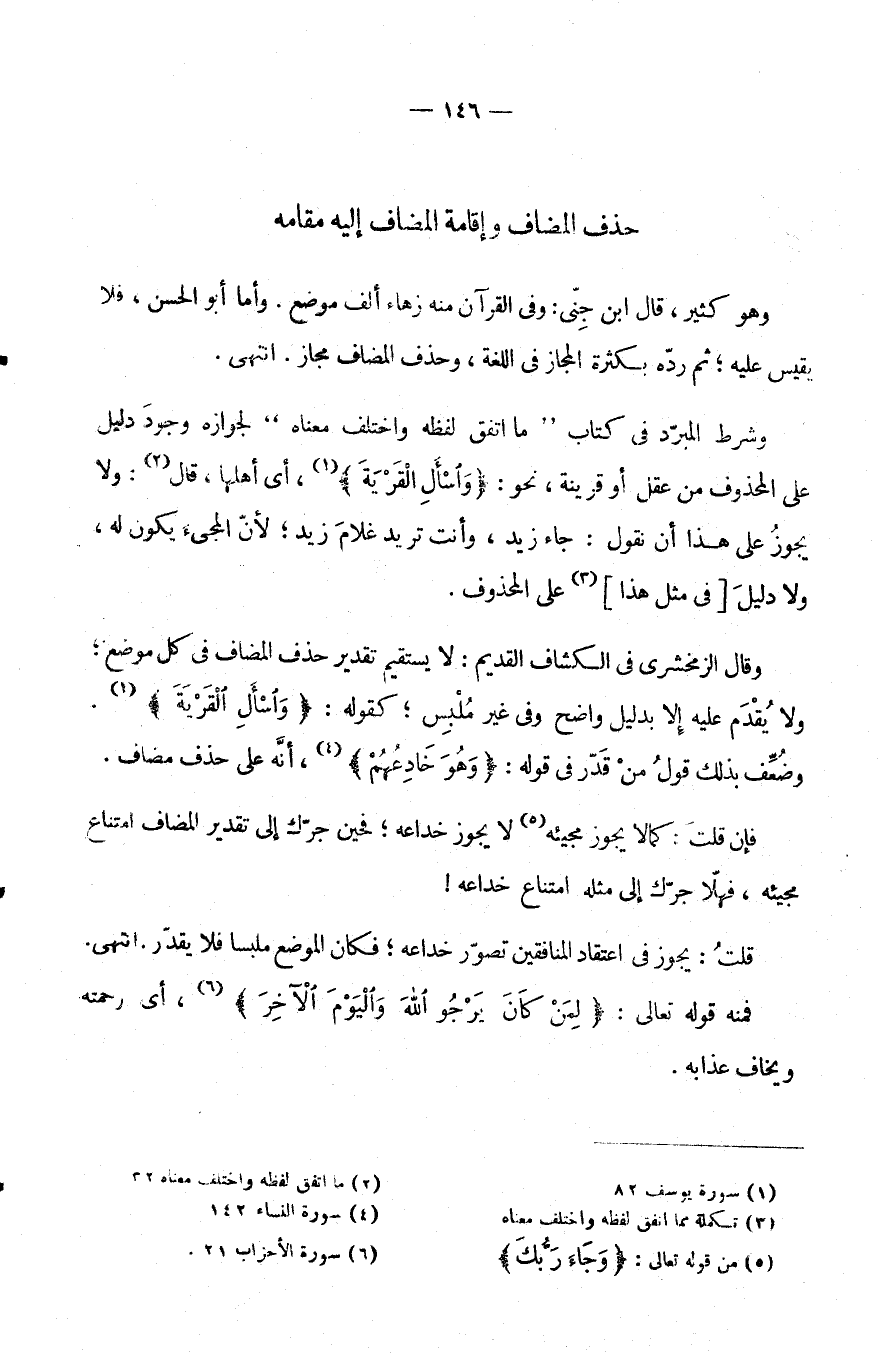 وَقَالَ الزَّمَخْشَرِيُّ فِي الْكَشَّافِ الْقَدِيمِ: لَا يَسْتَقِيمُ تَقْدِيرُ حَذْفِ الْمُضَافِ فِي كُلِّ مَوْضِعٍ وَلَا يُقْدَمُ عَلَيْهِ إِلَّا بِدَلِيلٍ وَاضِحٍ وفي غير ملبس كقوله: {واسأل القرية} .
