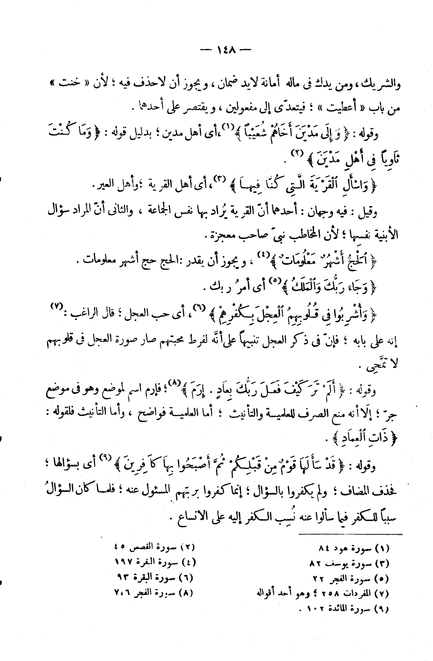 وَقَوْلُهُ: {قَدْ سَأَلَهَا قَوْمٌ مِنْ قَبْلِكُمْ ثُمَّ أصبحوا بها كافرين} أي بسؤالها فحذف المضاف وَلَمْ يَكْفُرُوا بِالسُّؤَالِ إِنَّمَا كَفَرُوا بِرَبِّهِمُ الْمَسْئُولِ عَنْهُ فَلَمَّا كَانَ السُّؤَالُ سَبَبًا لِلْكُفْرِ فِيمَا سَأَلُوا عَنْهُ نُسِبَ الْكُفْرُ إِلَيْهِ عَلَى الِاتِّسَاعِ.