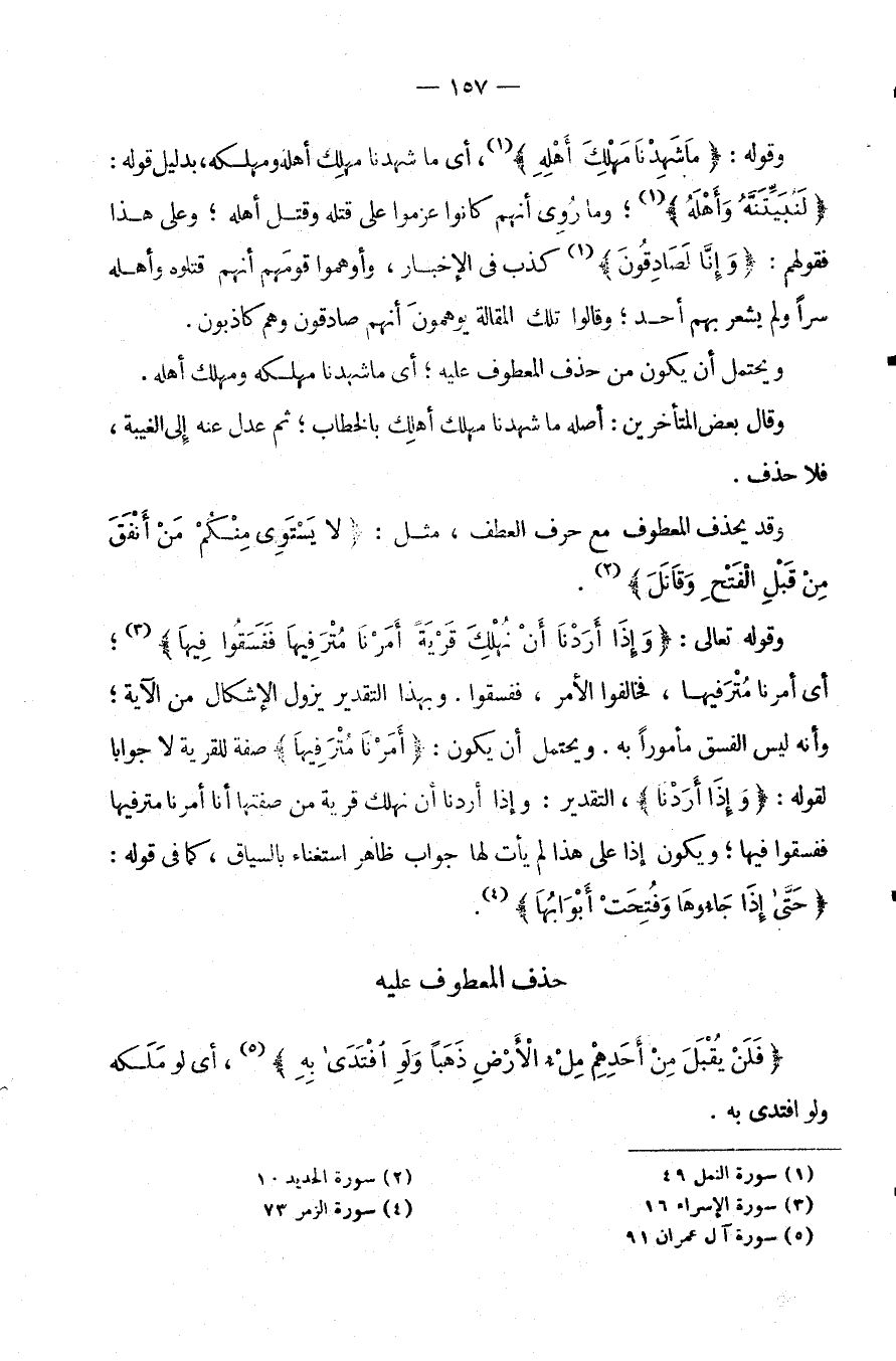 وَيُحْتَمَلُ أَنْ يَكُونَ مِنْ حَذْفِ الْمَعْطُوفِ عَلَيْهِ أَيْ مَا شَهِدْنَا مَهْلِكَهُ وَمَهْلِكَ أَهْلِهِ وَقَالَ بَعْضُ الْمُتَأَخِّرِينَ أَصْلُهُ مَا شَهِدْنَا مَهْلِكَ أَهْلِكَ بِالْخِطَابِ ثُمَّ عُدِلَ عَنْهُ إِلَى الْغَيْبَةِ فَلَا حَذْفَ.