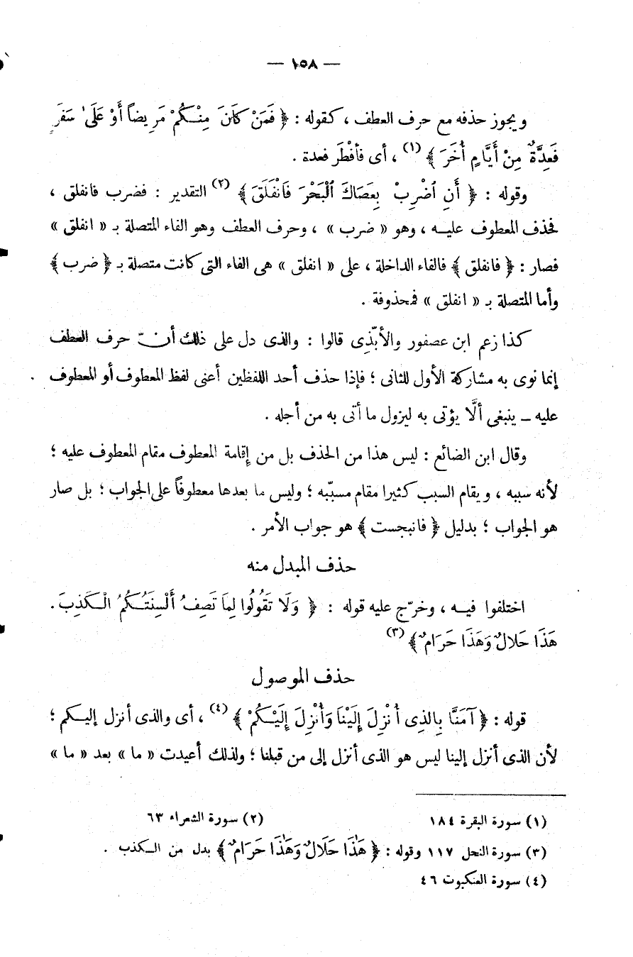 وَقَوْلِهِ: {أَنِ اضْرِبْ بِعَصَاكَ البحر} فانفلق التَّقْدِيرُ: فَضَرَبَ فَانْفَلَقَ فَحُذِفَ الْمَعْطُوفُ عَلَيْهِ وَهُوَ ضرب وحرف العطف وهو الفاء المتصلة انْفَلَقَ فَصَارَ: [فَانْفَلَقَ] فَالْفَاءُ الدَّاخِلَةُ عَلَى انْفَلَقَ هِيَ الْفَاءُ الَّتِي كَانَتْ مُتَّصِلَةً بِـ[ضَرَبَ] وَأَمَّا الْمُتَّصِلَةُ بِـ[انْفَلَقَ] فَمَحْذُوفَةٌ.