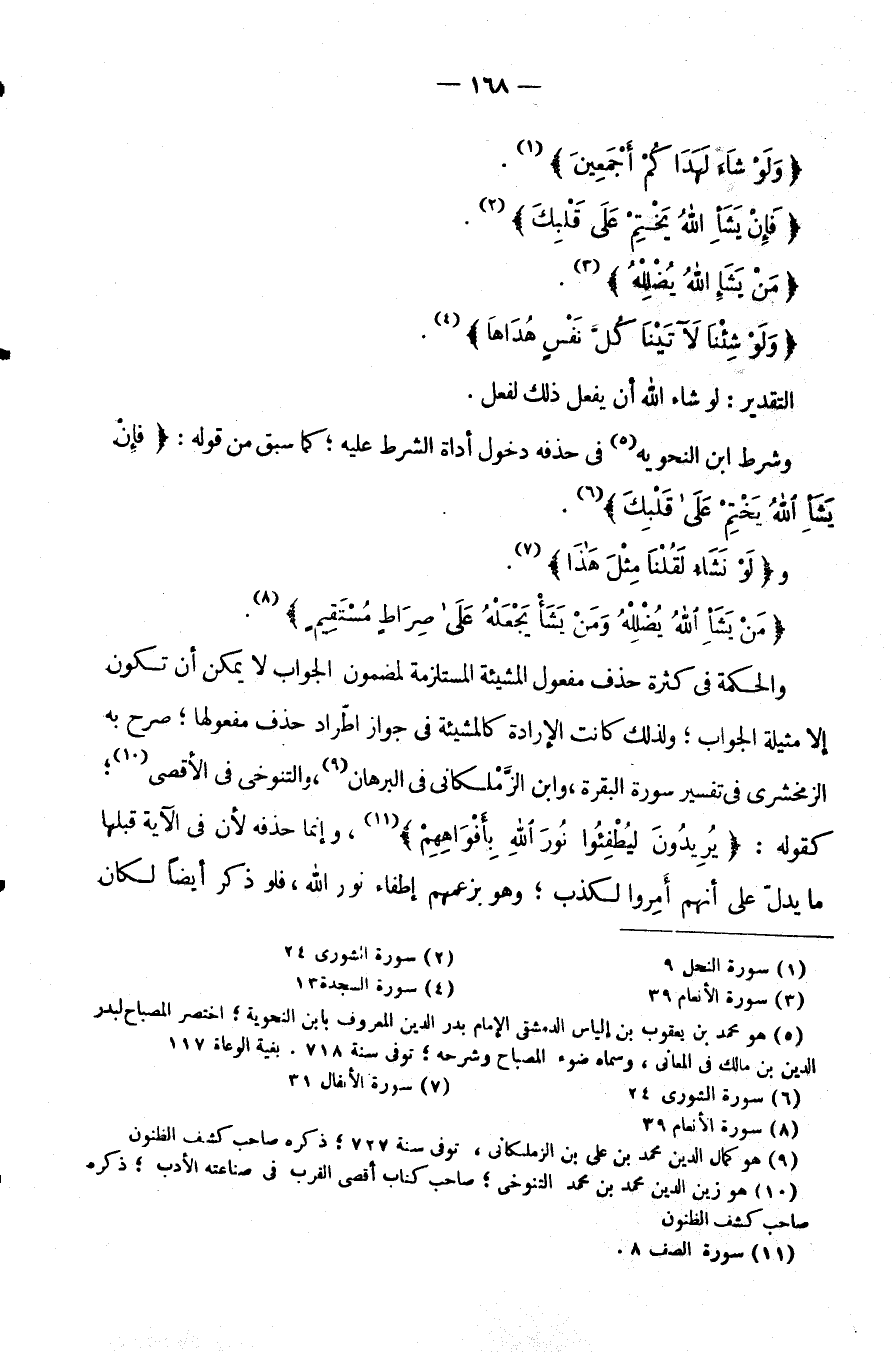 وَالْحِكْمَةُ فِي كَثْرَةِ حَذْفِ مَفْعُولِ الْمَشِيئَةِ الْمُسْتَلْزِمَةِ لِمَضْمُونِ الْجَوَابِ لَا يُمْكِنُ أَنْ تَكُونَ إِلَّا مَثِيلَةَ الْجَوَابِ وَلِذَلِكَ كَانَتِ الْإِرَادَةُ كَالْمَشِيئَةِ فِي جَوَازِ اطِّرَادِ حَذْفِ مَفْعُولِهَا صَرَّحَ بِهِ الزَّمَخْشَرِيُّ فِي تَفْسِيرِ سُورَةِ الْبَقَرَةِ وَابْنُ الزَّمْلَكَانِيِّ فِي الْبُرْهَانِ وَالتَّنُوخِيُّ فِي الْأَقْصَى كَقَوْلِهِ: {يُرِيدُونَ لِيُطْفِئُوا نور الله بأفواههم} وَإِنَّمَا حَذَفَهُ لِأَنَّ فِي الْآيَةِ قَبْلَهَا مَا يدل على أنهم أمروا لكذب وَهُوَ بِزَعْمِهِمْ إِطْفَاءُ نُورِ اللَّهِ فَلَوْ ذُكِرَ أيضا لكان
