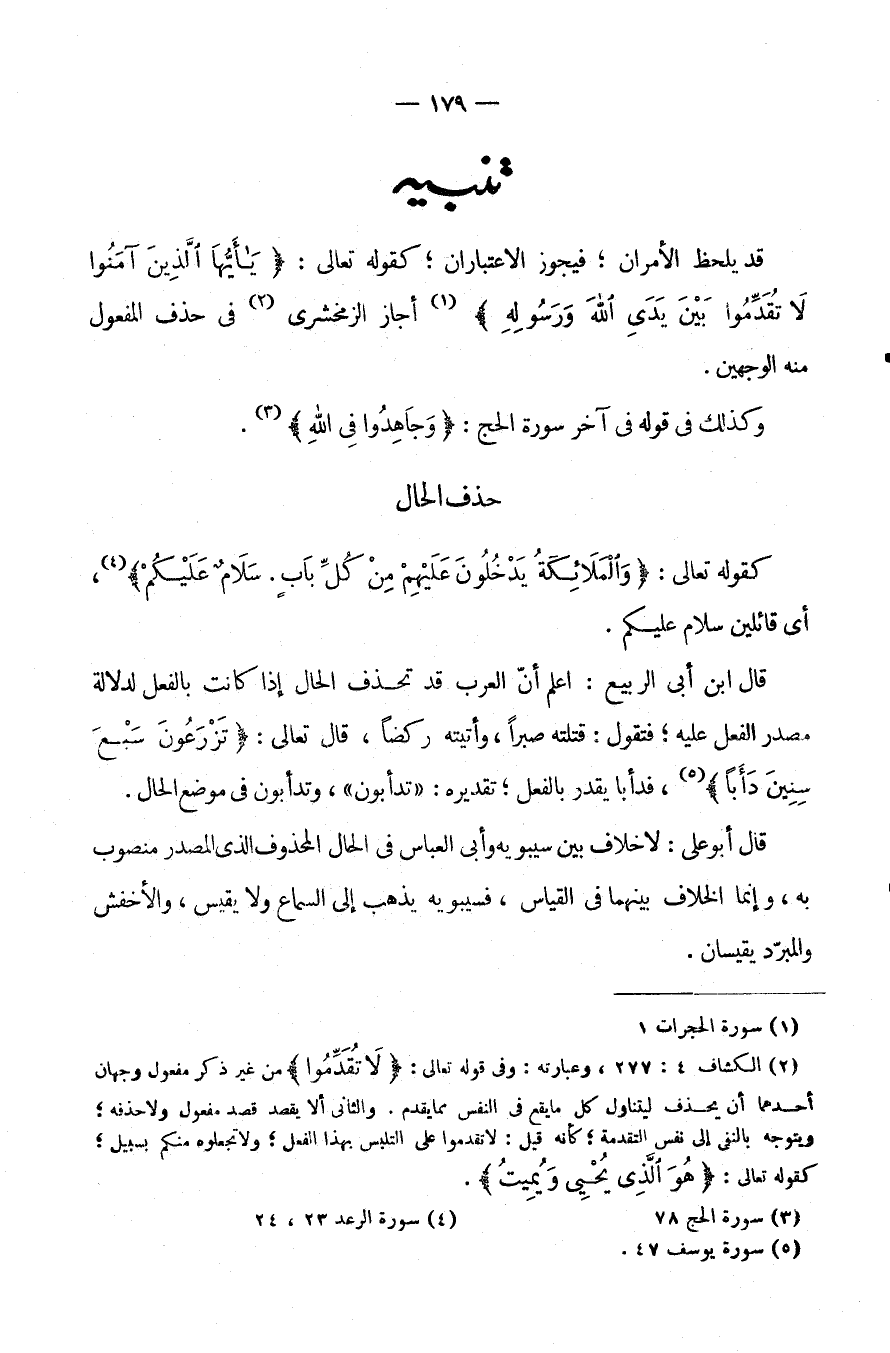 قَالَ ابْنُ أَبِي الرَّبِيعِ: اعْلَمْ أَنَّ الْعَرَبَ قَدْ تَحْذِفُ الْحَالَ إِذَا كَانَتْ بِالْفِعْلِ لِدَلَالَةِ مَصْدَرِ الْفِعْلِ عَلَيْهِ فَتَقُولُ قَتَلْتُهُ صَبْرًا وَأَتَيْتُهُ رَكْضًا، قَالَ تَعَالَى: {تزرعون سبع سنين دأبا} فَدَأَبًا يُقَدَّرُ بِالْفِعْلِ تَقْدِيرُهُ [تَدْأَبُونَ] فِي مَوْضِعِ الْحَالِ.