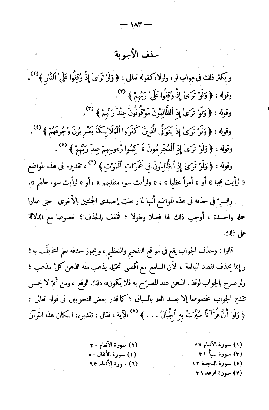 قَالُوا: وَحَذْفُ الْجَوَابِ يَقَعُ فِي مَوَاقِعِ التَّفْخِيمِ وَالتَّعْظِيمِ وَيَجُوزُ حَذْفُهُ لِعِلْمِ الْمُخَاطَبِ وَإِنَّمَا يُحْذَفُ لِقَصْدِ الْمُبَالَغَةِ لِأَنَّ السَّامِعَ مَعَ أَقْصَى تَخَيُّلِهِ يَذْهَبُ مِنْهُ الذِّهْنُ كُلَّ مَذْهَبٍ وَلَوْ صُرِّحَ بِالْجَوَابِ لَوَقَفَ الذِّهْنُ عِنْدَ الْمُصَرَّحِ بِهِ فَلَا يَكُونُ لَهُ ذَلِكَ الْوَقْعُ وَمِنْ ثَمَّ لَا يَحْسُنُ تَقْدِيرُ الْجَوَابِ مَخْصُوصًا إِلَّا بَعْدَ الْعِلْمِ بِالسِّيَاقِ كَمَا قَدَّرَ بَعْضُ النَّحْوِيِّينَ فِي قَوْلِهِ تَعَالَى: {ولو أن قرآنا سيرت به الجبال} الْآيَةَ، فَقَالَ: تَقْدِيرُهُ: لَكَانَ هَذَا الْقُرْآنُ.
