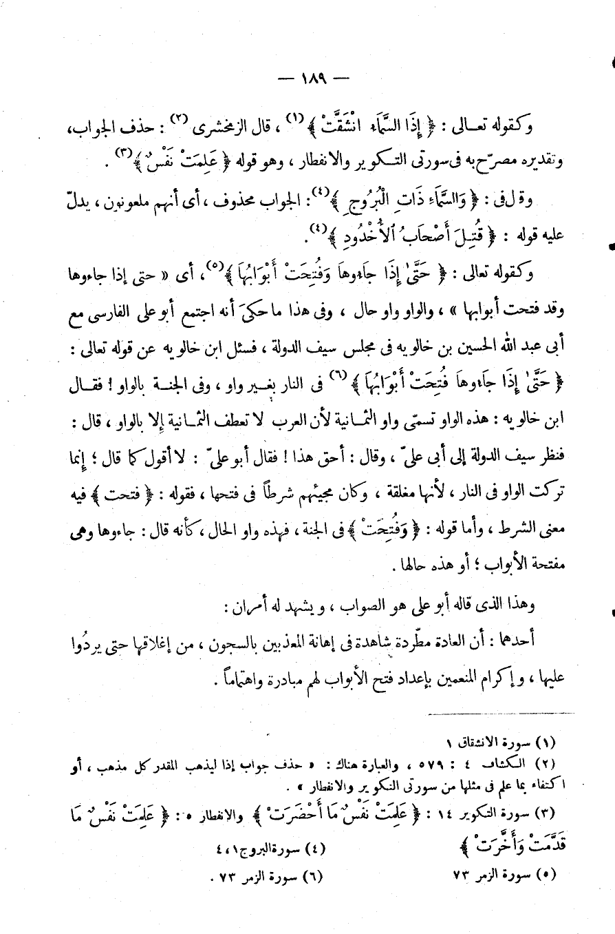 وَكَقَوْلِهِ تَعَالَى: {حَتَّى إِذَا جَاءُوهَا وَفُتِحَتْ أَبْوَابُهَا} أَيْ [حَتَّى إِذَا جَاءُوهَا وَقَدْ فُتِحَتْ أَبْوَابُهَا] والواو واو وحال وَفِي هَذَا مَا حُكِيَ أَنَّهُ اجْتَمَعَ أَبُو عَلِيٍّ الْفَارِسِيُّ مَعَ أَبِي عَبْدِ اللَّهِ الْحُسَيْنِ بْنِ خَالَوَيْهِ فِي مَجْلِسِ سَيْفِ الدَّوْلَةِ فَسُئِلَ ابْنُ خَالَوَيْهِ عَنْ قَوْلِهِ تَعَالَى: {حَتَّى إِذَا جاءوها وفتحت أبوابها} ، فِي النَّارِ بِغَيْرِ وَاوٍ، وَفِي الْجَنَّةِ بِالْوَاوِ! فَقَالَ ابْنُ خَالَوَيْهِ: هَذِهِ الْوَاوُ تُسَمَّى وَاوَ الثَّمَانِيَةِ لِأَنَّ الْعَرَبَ لَا تَعْطِفُ الثَّمَانِيَةَ إِلَّا بِالْوَاوِ قَالَ: فَنَظَرَ سَيْفُ الدَّوْلَةِ إِلَى أَبِي عَلِيٍّ وَقَالَ أَحَقٌّ هَذَا فَقَالَ أَبُو عَلِيٍّ: لَا أَقُولُ كَمَا قَالَ إِنَّمَا تُرِكَتِ الْوَاوُ فِي النَّارِ لِأَنَّهَا مُغْلَقَةٌ وَكَانَ مَجِيئُهُمْ شَرْطًا فِي فَتْحِهَا فَقَوْلُهُ: {فُتِحَتْ} فِيهِ مَعْنَى الشَّرْطِ وَأَمَّا قَوْلُهُ: {وَفُتِحَتْ} فِي الْجَنَّةِ فَهَذِهِ وَاوُ الْحَالِ كَأَنَّهُ قَالَ جَاءُوهَا وَهِيَ مُفَتَّحَةُ الْأَبْوَابِ أَوْ هَذِهِ حَالُهَا.