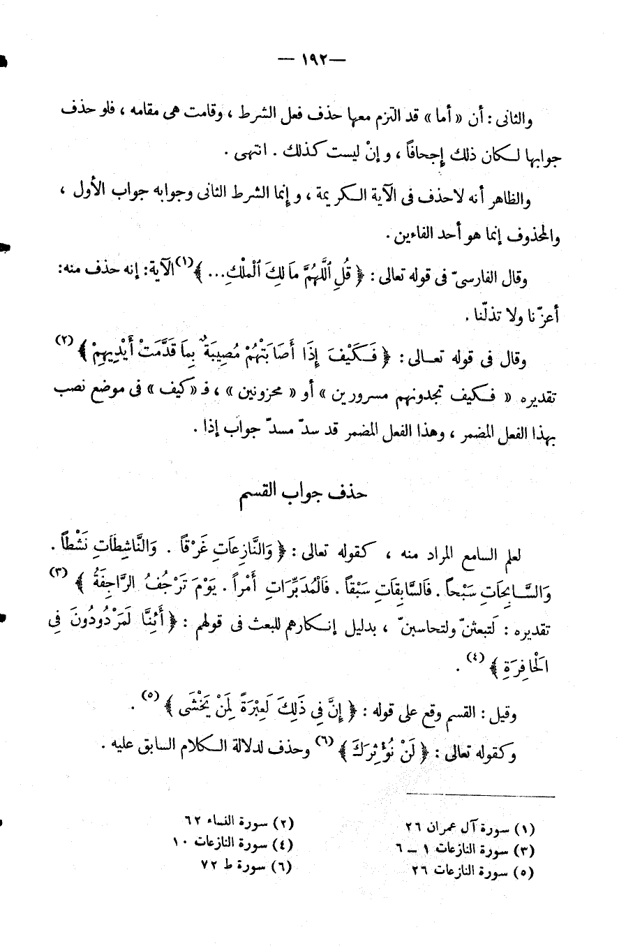 لِعِلْمِ السَّامِعِ الْمُرَادَ مِنْهُ كَقَوْلِهِ تَعَالَى: {وَالنَّازِعَاتِ غَرْقًا وَالنَّاشِطَاتِ نَشْطًا وَالسَّابِحَاتِ سَبْحًا فَالسَّابِقَاتِ سَبْقًا فَالْمُدَبِّرَاتِ أَمْرًا يَوْمَ ترجف الراجفة} ، تَقْدِيرُهُ: لَتُبْعَثُنَّ وَلَتُحَاسَبُنَّ بِدَلِيلِ إِنْكَارِهِمْ لِلْبَعْثِ فِي قولهم: {أإنا لمردودون في الحافرة} .