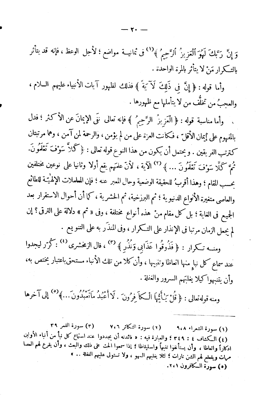 وَمِنْهُ تَكْرَارُ: {فذوقوا عذابي ونذر} قَالَ الزَّمَخْشَرِيُّ: كَرَّرَ لِيَجِدُوا عِنْدَ سَمَاعِ كُلِّ نَبَإٍ مِنْهَا اتِّعَاظًا وَتَنْبِيهًا وَأَنَّ كُلًّا مِنْ تِلْكَ الْأَنْبَاءِ مُسْتَحَقٌّ بِاعْتِبَارٍ يَخْتَصُّ بِهِ وَأَنْ يَتَنَبَّهُوا كَيْلَا يَغْلِبَهُمُ السُّرُورُ وَالْغَفْلَةُ وَمِنْهُ قَوْلُهُ تعالى قل يأيها الكافرون لا أعبد ما تعبدون إلى آخرها.