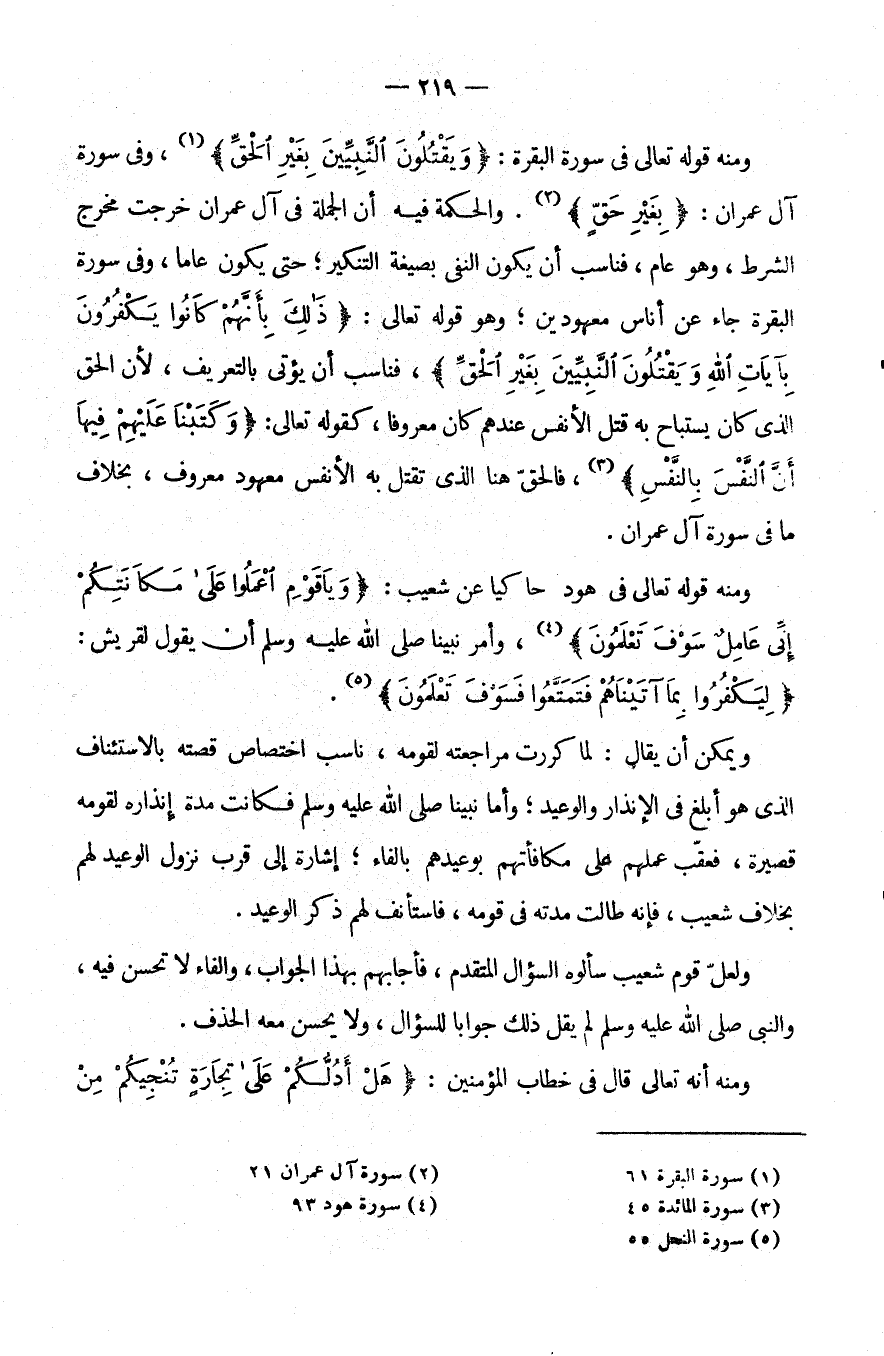 وَمِنْهُ قَوْلُهُ تَعَالَى فِي سُورَةِ الْبَقَرَةِ {وَيَقْتُلُونَ النبيين بغير الحق} 1 وفي سورة آل عمران {بغير حق} وَالْحِكْمَةُ فِيهِ أَنَّ الْجُمْلَةَ فِي آلِ عِمْرَانَ خَرَجَتْ مَخْرَجَ الشَّرْطِ وَهُوَ عَامٌّ فَنَاسَبَ أَنْ يَكُونَ النَّفْيُ بِصِيغَةِ التَّنْكِيرِ حَتَّى يَكُونَ عَامًّا وَفِي سُورَةِ الْبَقَرَةِ جَاءَ عَنْ أُنَاسٍ مَعْهُودِينَ وَهُوَ قَوْلُهُ تَعَالَى {ذَلِكَ بِأَنَّهُمْ كَانُوا يَكْفُرُونَ بآيات الله ويقتلون النبيين بغير الحق} فَنَاسَبَ أَنْ يُؤْتَى بِالتَّعْرِيفِ لِأَنَّ الْحَقَّ الَّذِي كَانَ يُسْتَبَاحُ بِهِ قَتْلُ الْأَنْفُسِ عِنْدَهُمْ كَانَ مَعْرُوفًا كَقَوْلِهِ تَعَالَى {وَكَتَبْنَا عَلَيْهِمْ فِيهَا أَنَّ النفس بالنفس} فَالْحَقُّ هُنَا الَّذِي تُقْتَلُ بِهِ الْأَنْفُسُ مَعْهُودٌ مَعْرُوفٌ بِخِلَافِ مَا فِي سُورَةِ آلِ عِمْرَانَ