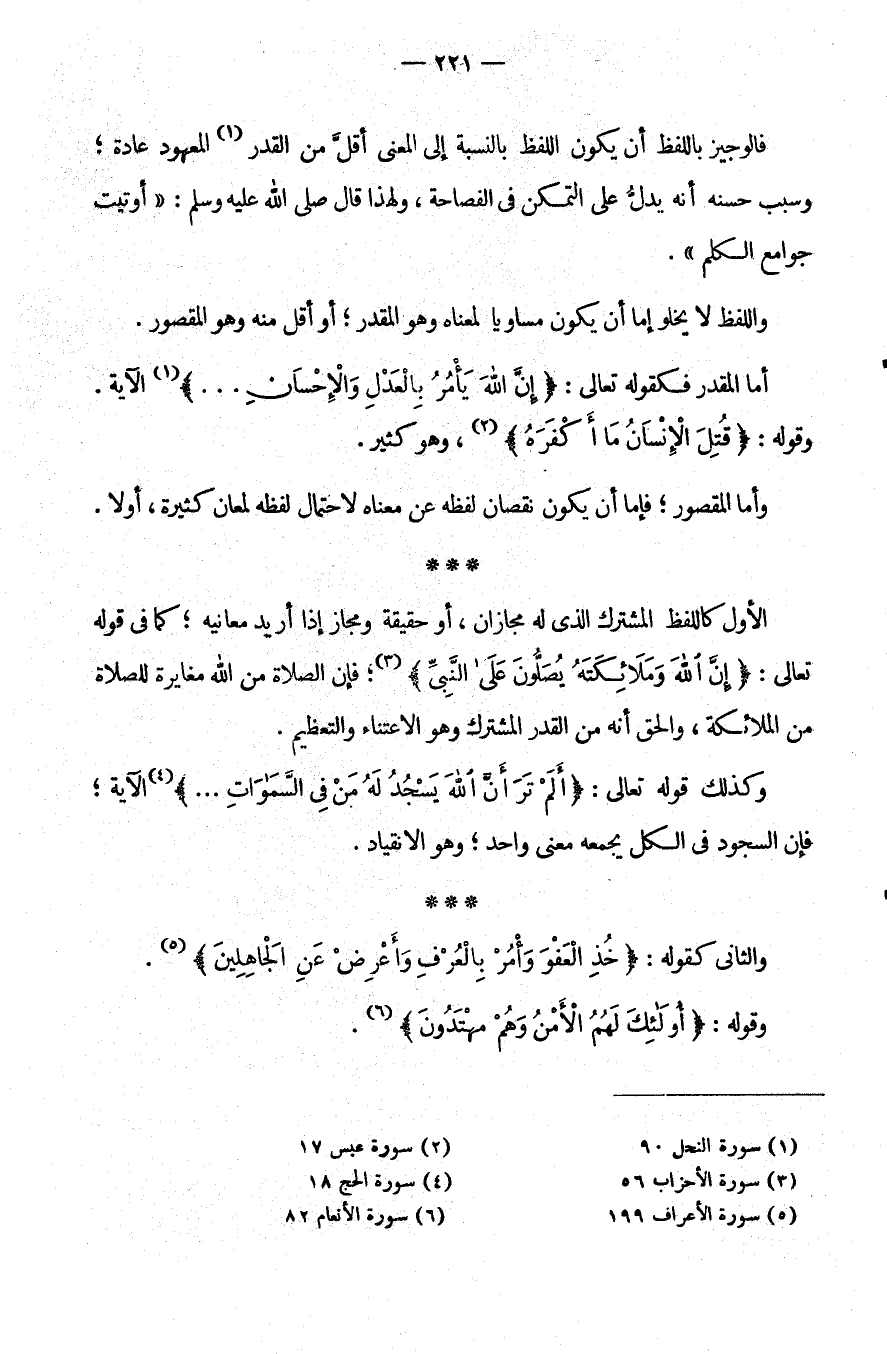 الْأَوَّلُ: كَاللَّفْظِ الْمُشْتَرَكِ الَّذِي لَهُ مَجَازَانِ، أَوْ حَقِيقَةٌ وَمَجَازٌ إِذَا أُرِيدَ مَعَانِيهِ كَمَا فِي قَوْلِهِ تَعَالَى: {إِنَّ اللَّهَ وَمَلَائِكَتَهُ يُصَلُّونَ عَلَى النبي} فَإِنَّ الصَّلَاةَ مِنَ اللَّهِ مُغَايِرَةٌ لِلصَّلَاةِ مِنَ الْمَلَائِكَةِ وَالْحَقُّ أَنَّهُ مِنَ الْقَدْرِ الْمُشْتَرَكِ وَهُوَ الِاعْتِنَاءُ وَالتَّعْظِيمُ وَكَذَلِكَ قَوْلُهُ تَعَالَى: {أَلَمْ تَرَ أَنَّ اللَّهَ يَسْجُدُ لَهُ مَنْ فِي السَّمَاوَاتِ} الْآيَةَ. فَإِنَّ السُّجُودَ فِي الْكُلِّ يَجْمَعُهُ مَعْنًى وَاحِدٌ وَهُوَ الِانْقِيَادُ.