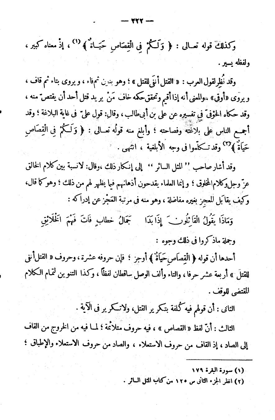 أَحَدُهَا: أَنَّ قَوْلَهُ: {الْقِصَاصِ حَيَاةٌ} أَوْجَزُ فَإِنَّ حُرُوفَهُ عَشْرَةٌ وَحُرُوفُ "الْقَتْلُ أَنْفَى لِلْقَتْلِ" أَرْبَعَةَ عَشَرَ حَرْفًا وَالتَّاءُ وَأَلِفُ الْوَصْلِ سَاقِطَانِ لَفْظًا وَكَذَا التَّنْوِينُ لِتَمَامِ الْكَلَامِ الْمُقْتَضِي لِلْوَقْفِ.