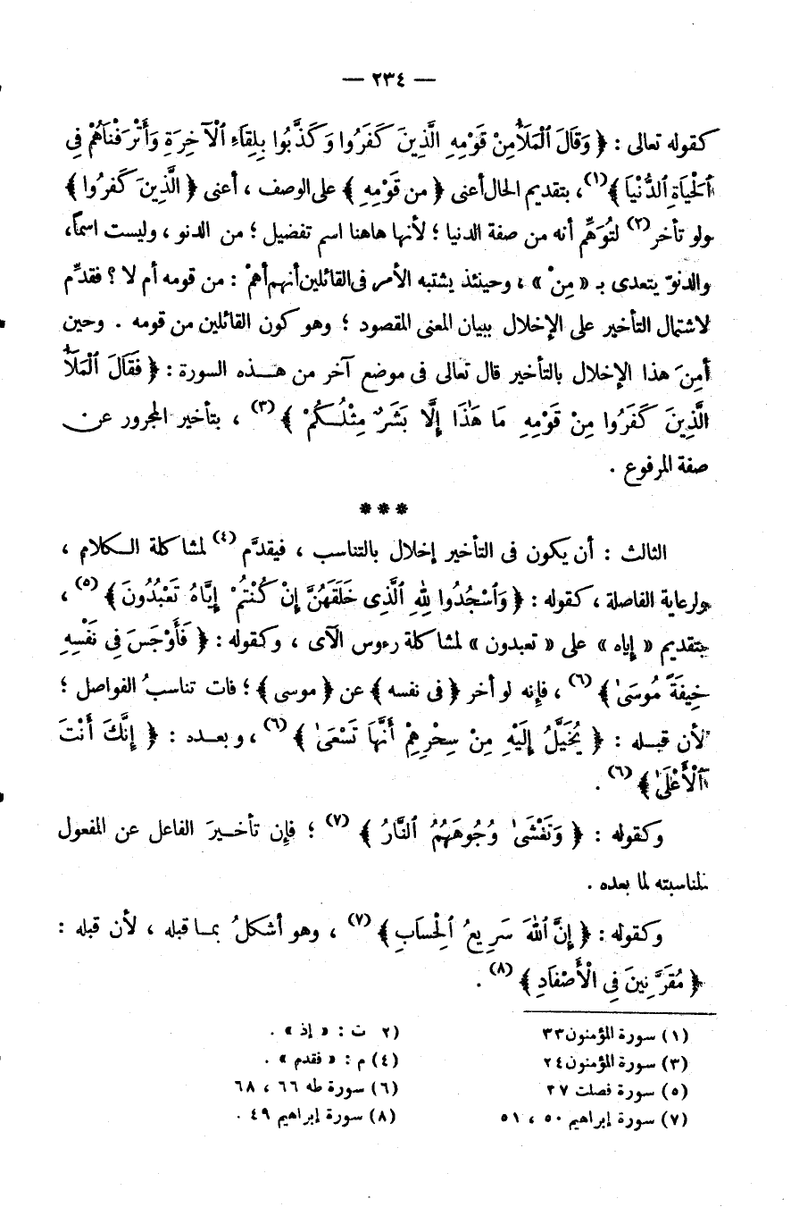 الثَّالِثُ: أَنْ يَكُونَ فِي التَّأْخِيرِ إِخْلَالٌ بِالتَّنَاسُبِ فَيُقَدَّمَ لِمُشَاكَلَةِ الْكَلَامِ وَلِرِعَايَةِ الْفَاصِلَةِ كَقَوْلِهِ: {وَاسْجُدُوا لِلَّهِ الَّذِي خلقهن إن كنتم إياه تعبدون} ، بِتَقْدِيمِ "إِيَّاهُ" عَلَى "تَعْبُدُونَ" لِمُشَاكَلَةِ رُءُوسِ الْآيِ وكقوله: {فأوجس في نفسه خيفة موسى} فإنه لو أخر {في نفسه} عن {موسى} فَاتَ تَنَاسُبُ الْفَوَاصِلِ لِأَنَّ قَبْلَهُ: {يُخَيَّلُ إِلَيْهِ من سحرهم أنها تسعى} وبعده،: {إنك أنت الأعلى} .