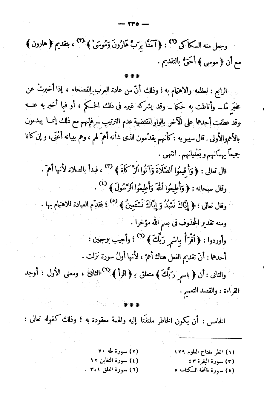 وَجَعَلَ مِنْهُ السَّكَّاكِيُّ: {آمَنَّا بِرَبِّ هَارُونَ وَمُوسَى} بتقديم "هارون" مع أن "موسى" أَحَقُّ بِالتَّقْدِيمِ.