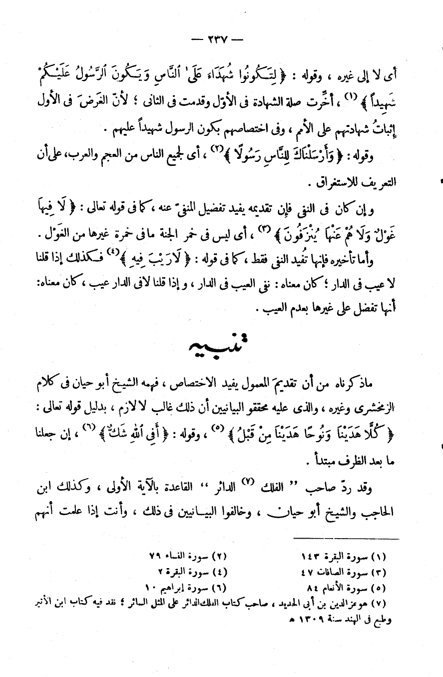 وَقَدْ رَدَّ صَاحِبُ "الْفَلَكِ الدَّائِرِ" الْقَاعِدَةَ بِالْآيَةِ الْأُولَى وَكَذَلِكَ ابْنُ الْحَاجِبِ وَالشَّيْخُ أَبُو حَيَّانَ وَخَالَفُوا الْبَيَانِيِّينَ فِي ذَلِكَ وَأَنْتَ إِذَا عَلِمْتَ أَنَّهُمْ.