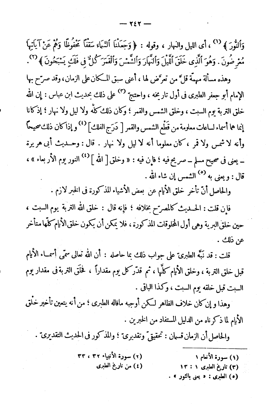 وَهَذِهِ مَسْأَلَةٌ مُهِمَّةٌ قَلَّ مَنْ تَعَرَّضَ لَهَا أَعْنِي سَبْقَ الْمَكَانِ عَلَى الزَّمَانِ وَقَدْ صَرَّحَ بِهَا الْإِمَامُ أَبُو جَعْفَرٍ الطَّبَرِيُّ فِي أَوَّلِ تَارِيخِهِ وَاحْتَجَّ عَلَى ذَلِكَ بِحَدِيثِ ابْنِ عَبَّاسٍ: إِنَّ اللَّهَ خَلَقَ التُّرْبَةَ يَوْمَ السَّبْتِ وَخَلَقَ الشَّمْسَ وَالْقَمَرَ وَكَانَ ذَلِكَ كُلُّهُ وَلَا لَيْلَ وَلَا نَهَارَ إِذْ كَانَا إِنَّمَا هُمَا أَسْمَاءٌ لِسَاعَاتٍ مَعْلُومَةٍ مِنْ قَطْعِ الشَّمْسِ وَالْقَمَرِ "دَرَجَ الْفَلَكِ" وَإِذَا كَانَ ذَلِكَ صَحِيحًا وَأَنَّهُ لَا شَمْسَ وَلَا قَمَرَ كَانَ مَعْلُومًا أَنَّهُ لَا لَيْلَ وَلَا نَهَارَ قَالَ: وَحَدِيثُ أَبِي هُرَيْرَةَ - يَعْنِي فِي صَحِيحِ مُسْلِمٍ - صَرِيحٌ فِيهِ فَإِنَّ فِيهِ: " وَخَلَقَ [اللَّهُ] النُّورَ يَوْمَ الْأَرْبِعَاءِ " قَالَ: وَيَعْنِي بِهِ الشَّمْسَ إِنْ شَاءَ اللَّهُ.