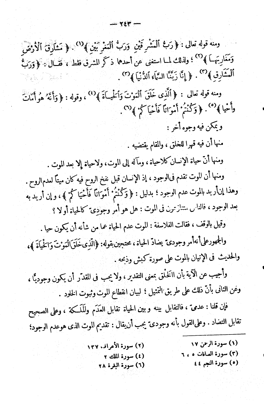 وَهَذَا إِنْ أُرِيدَ بِالْمَوْتِ عدم الوجود بدليل {وكنتم أمواتا فأحياكم} وإن أريد به بعد الوجود فالناس منتازعون فِي الْمَوْتِ هَلْ هُوَ أَمْرٌ وُجُودِيٌّ كَالْحَيَاةِ أولا؟.
