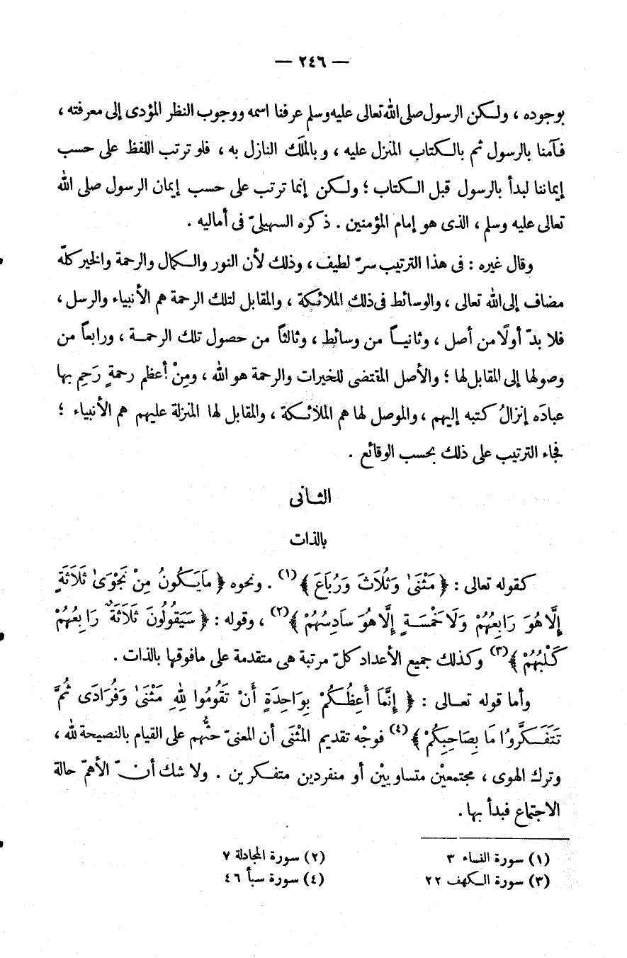 وَأَمَّا قَوْلُهُ تَعَالَى: {إِنَّمَا أَعِظُكُمْ بِوَاحِدَةٍ أَنْ تَقُومُوا لِلَّهِ مَثْنَى وفرادى ثم تتفكروا ما بصاحبكم} فَوَجْهُ تَقْدِيمِ الْمَثْنَى أَنَّ الْمَعْنَى حَثُّهُمْ عَلَى الْقِيَامِ بِالنَّصِيحَةِ لِلَّهِ وَتَرْكِ الْهَوَى مُجْتَمِعِينَ مُتَسَاوِيِينَ أَوْ مُنْفَرِدِينَ مُتَفَكِّرِينَ وَلَا شَكَّ أَنَّ الْأَهَمَّ حَالَةُ الِاجْتِمَاعِ فَبَدَأَ بِهَا.