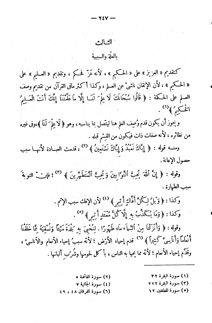 كَتَقْدِيمِ "الْعَزِيزِ" عَلَى "الْحَكِيمِ" لِأَنَّهُ عَزَّ فَحَكَمَ وَتَقْدِيمِ "الْعَلِيمِ" عَلَى "الْحَكِيمِ" لأن الإتقان ناشىء عَنِ الْعِلْمِ وَكَذَا أَكْثَرُ مَا فِي الْقُرْآنِ مِنْ تَقْدِيمِ وَصْفِ الْعِلْمِ عَلَى الْحِكْمَةِ: {قَالُوا سُبْحَانَكَ لَا عِلْمَ لَنَا إِلَّا مَا عَلَّمْتَنَا إنك أنت العليم الحكيم} .