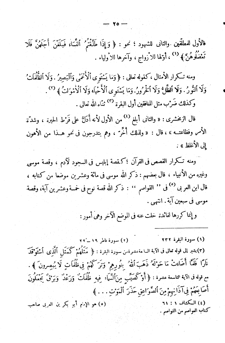 وَمِنْهُ تَكْرَارُ الْقِصَصِ فِي الْقُرْآنِ كَقِصَّةِ إِبْلِيسَ فِي السُّجُودِ لِآدَمَ وَقِصَّةِ مُوسَى وَغَيْرِهِ مِنَ الْأَنْبِيَاءِ، قَالَ بَعْضُهُمْ: ذَكَرَ اللَّهُ مُوسَى فِي مِائَةٍ وَعِشْرِينَ مَوْضِعًا مِنْ كِتَابِهِ، قَالَ ابْنُ الْعَرَبِيِّ فِي الْقَوَاصِمِ:" ذَكَرَ اللَّهُ قِصَّةَ نُوحٍ فِي خَمْسَةٍ وَعِشْرِينَ آيَةٍ، وَقِصَّةَ مُوسَى فِي سَبْعِينَ آيَةٍ". انْتَهَى.