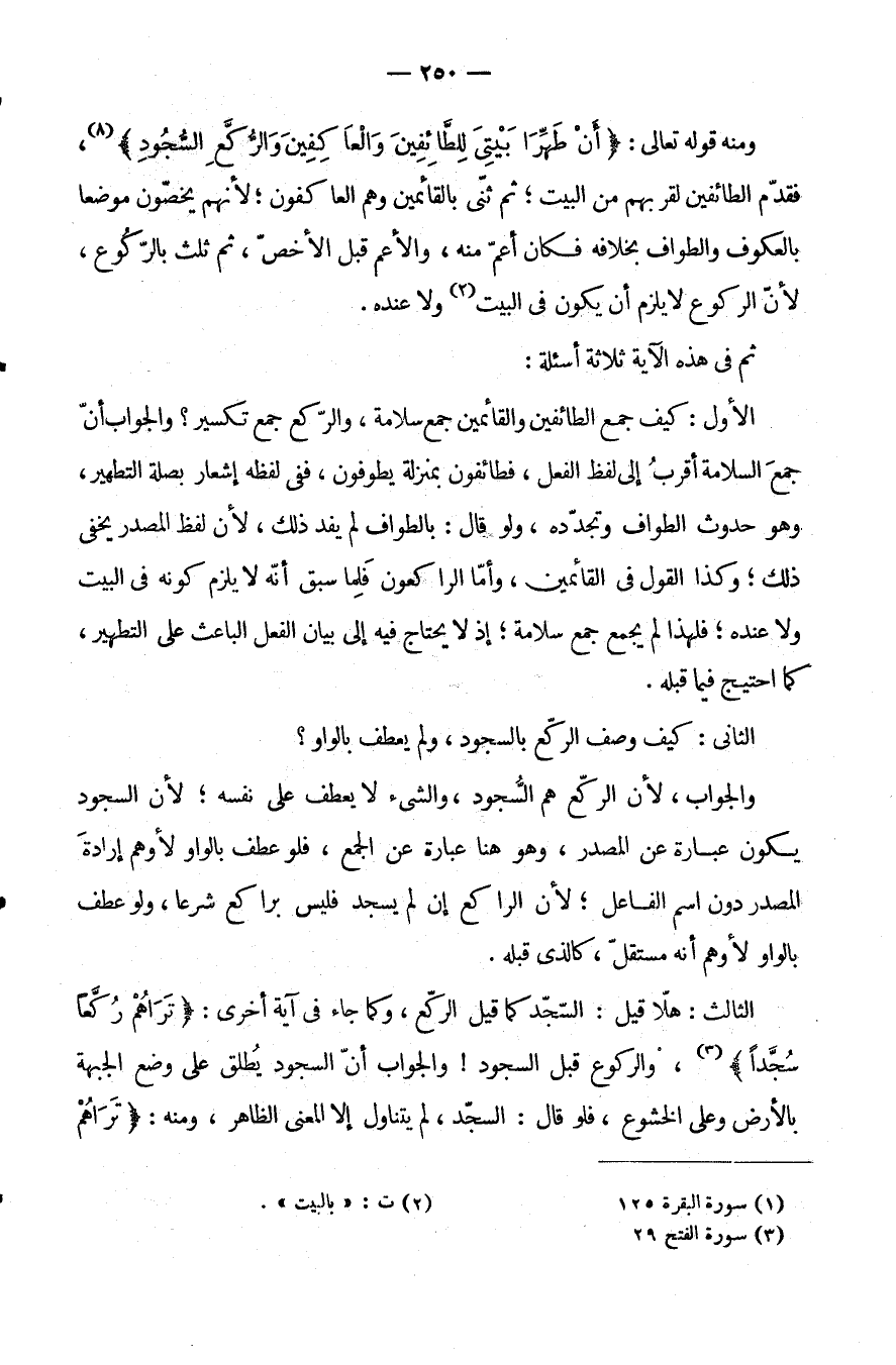 الْأَوَّلُ: كَيْفَ جَمَعَ الطَّائِفِينَ وَالْقَائِمِينَ جَمْعَ سَلَامَةٍ وَالرُّكَّعَ جَمْعَ تَكْسِيرٍ؟ وَالْجَوَابُ: أَنَّ جَمْعَ السَّلَامَةِ أَقْرَبُ إِلَى لفظ الفعل فطائفون بِمَنْزِلَةِ يَطُوفُونَ فَفِي لَفْظِهِ إِشْعَارٌ بِصِلَةِ التَّطْهِيرِ وَهُوَ حُدُوثُ الطَّوَافِ وَتَجَدُّدُهُ وَلَوْ قَالَ: بِالطُّوَّافِ لَمْ يُفِدْ ذَلِكَ لِأَنَّ لَفْظَ الْمَصْدَرِ يُخْفِي ذَلِكَ وَكَذَا الْقَوْلُ فِي الْقَائِمَيْنِ وَأَمَّا الرَّاكِعُونَ فَلِمَا سَبَقَ أَنَّهُ لَا يَلْزَمُ كَوْنَهُ فِي الْبَيْتِ وَلَا عِنْدَهُ فَلِهَذَا لَمْ يُجْمَعْ جَمْعَ سَلَامَةٍ إِذْ لَا يُحْتَاجُ فِيهِ إِلَى بَيَانِ الْفِعْلِ الْبَاعِثِ عَلَى التَّطْهِيرِ كَمَا احْتِيجَ فِيمَا قَبْلَهُ.