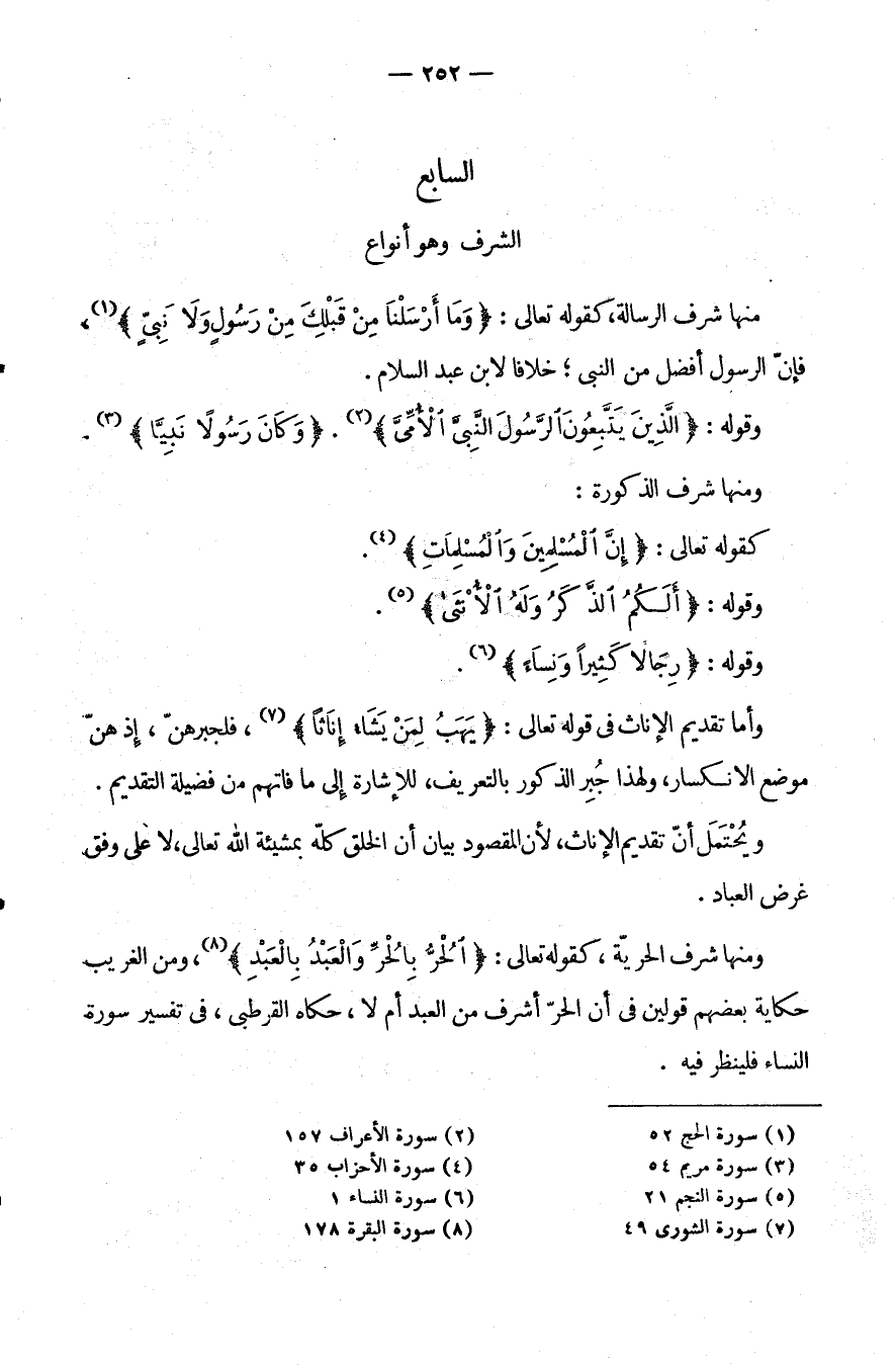 وَمِنْهَا: شَرَفُ الْحُرِّيَّةِ، كَقَوْلِهِ تَعَالَى: {الْحُرُّ بِالْحُرِّ وَالْعَبْدُ بالعبد} وَمِنَ الْغَرِيبِ حِكَايَةُ بَعْضِهِمْ قَوْلَيْنِ فِي أَنَّ الْحُرَّ أَشْرَفُ مِنَ الْعَبْدِ أَمْ لَا حَكَاهُ الْقُرْطُبِيُّ فِي تَفْسِيرِ سُورَةِ النِّسَاءِ فَلْيُنْظَرْ فِيهِ.