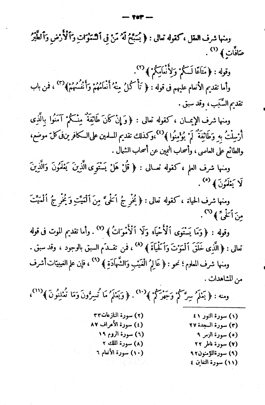 وَمِنْهَا: شَرَفُ الْعِلْمِ، كَقَوْلِهِ تَعَالَى: {قُلْ هَلْ يستوي الذين يعلمون والذين لا يعلمون} .