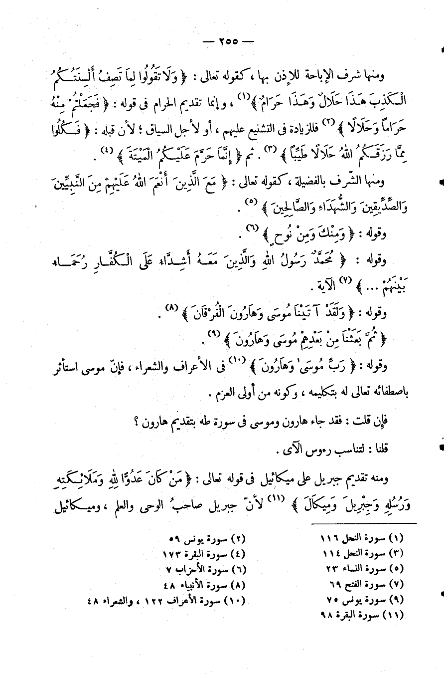 وَمِنْهَا: الشَّرَفُ بِالْفَضِيلَةِ، كَقَوْلِهِ تَعَالَى: {مَعَ الَّذِينَ أَنْعَمَ اللَّهُ عَلَيْهِمْ مِنَ النَّبِيِّينَ وَالصِّدِّيقِينَ وَالشُّهَدَاءِ والصالحين} وقوله: {ومنك ومن نوح} وَقَوْلِهِ: {مُحَمَّدٌ رَسُولُ اللَّهِ وَالَّذِينَ مَعَهُ أَشِدَّاءُ عَلَى الْكُفَّارِ رُحَمَاءُ بَيْنَهُمْ} الْآيَةِ. وَقَوْلِهِ: {وَلَقَدْ آتَيْنَا مُوسَى وَهَارُونَ الْفُرْقَانَ} {ثم بعثنا من بعدهم موسى وهارون} وقوله: {رب موسى وهارون} فِي الْأَعْرَافِ وَالشُّعَرَاءِ فَإِنَّ مُوسَى اسْتَأْثَرَ بِاصْطِفَائِهِ تَعَالَى لَهُ بِتَكْلِيمِهِ وَكَوْنِهِ مِنْ أُولِي الْعَزْمِ فَإِنْ قُلْتَ فَقَدْ جَاءَ هَارُونَ وَمُوسَى فِي سُورَةِ طه بِتَقْدِيمِ هَارُونَ قُلْنَا لِتَنَاسُبِ رُءُوسِ الْآيِ وَمِنْهُ تَقْدِيمُ جِبْرِيلَ عَلَى مِيكَائِيلَ فِي قَوْلِهِ تَعَالَى: {مَنْ كَانَ عَدُوًّا لِلَّهِ وَمَلَائِكَتِهِ وَرُسُلِهِ وجبريل وميكال} لِأَنَّ جِبْرِيلَ صَاحِبُ الْوَحْيِ وَالْعِلْمِ وَمِيكَائِيلَ.