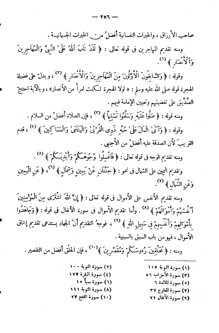 وَمِنْهُ قَوْلُهُ: {صَلُّوا عَلَيْهِ وَسَلِّمُوا تسليما} فَإِنَّ الصَّلَاةَ أَفْضَلُ مِنَ السَّلَامِ وَقَوْلُهُ: {وَآتَى الْمَالَ عَلَى حُبِّهِ ذَوِي الْقُرْبَى وَالْيَتَامَى وَالْمَسَاكِينَ} قُدِّمَ الْقَرِيبُ لِأَنَّ الصَّدَقَةَ عَلَيْهِ أَفْضَلُ مِنَ الْأَجْنَبِيِّ.