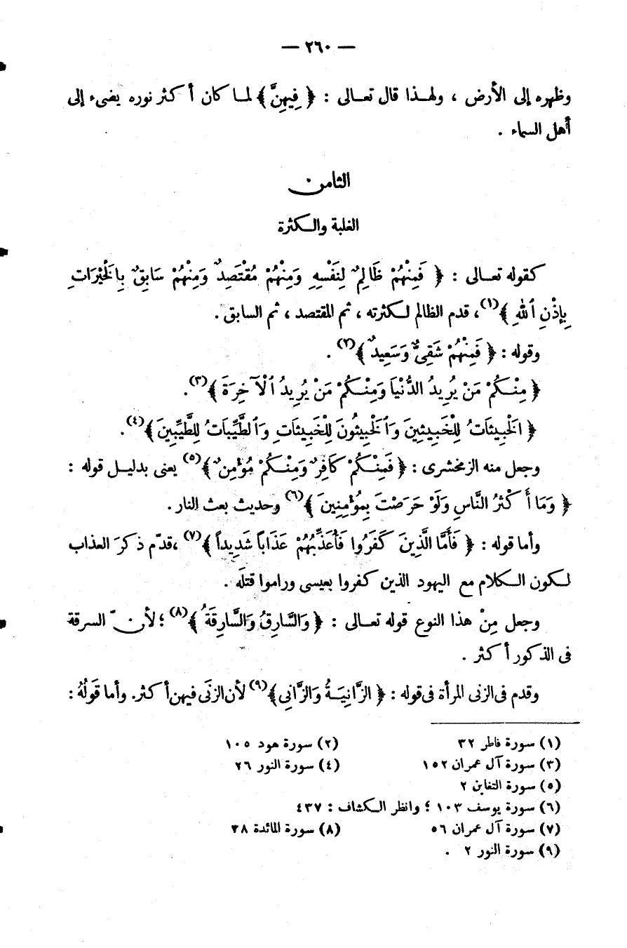 كقوله تعالى: {منهم ظَالِمٌ لِنَفْسِهِ وَمِنْهُمْ مُقْتَصِدٌ وَمِنْهُمْ سَابِقٌ بِالْخَيْرَاتِ بإذن الله} قَدَّمَ الظَّالِمَ لِكَثْرَتِهِ ثُمَّ الْمُقْتَصِدَ ثُمَّ السَّابِقَ.