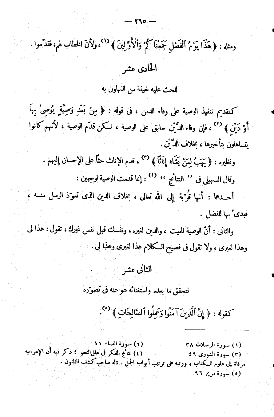 كَتَقْدِيمِ تَنْفِيذِ الْوَصِيَّةِ عَلَى وَفَاءِ الدَّيْنِ فِي قَوْلِهِ: {مِنْ بعد وصية يوصي بها أو دين} فَإِنَّ وَفَاءَ الدَّيْنِ سَابِقٌ عَلَى الْوَصِيَّةِ لَكِنْ قَدَّمَ الْوَصِيَّةِ لِأَنَّهُمْ كَانُوا يَتَسَاهَلُونَ بِتَأْخِيرِهَا بِخِلَافِ الدين.