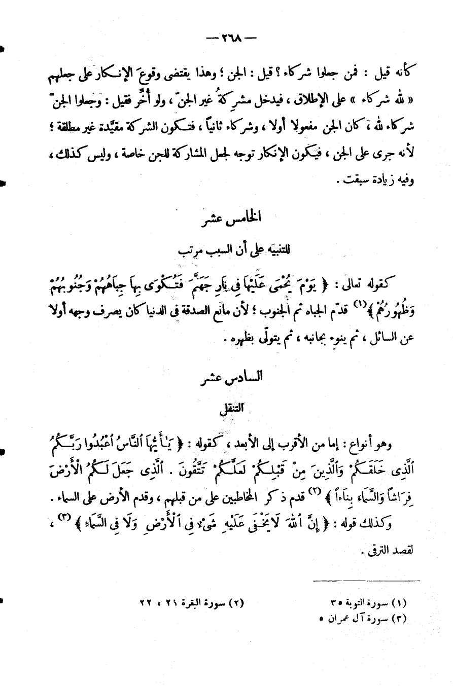 كَقَوْلِهِ تَعَالَى: {يَوْمَ يُحْمَى عَلَيْهَا فِي نَارِ جَهَنَّمَ فَتُكْوَى بِهَا جِبَاهُهُمْ وَجُنُوبُهُمْ وَظُهُورُهُمْ} قَدَّمَ الْجِبَاهَ ثُمَّ الْجُنُوبَ لِأَنَّ مَانِعَ الصَّدَقَةِ فِي الدُّنْيَا كَانَ يَصْرِفُ وَجْهَهُ أَوَّلًا عَنِ السائل ثم ينوه بِجَانِبِهِ ثُمَّ يَتَوَلَّى بِظَهْرِهِ.