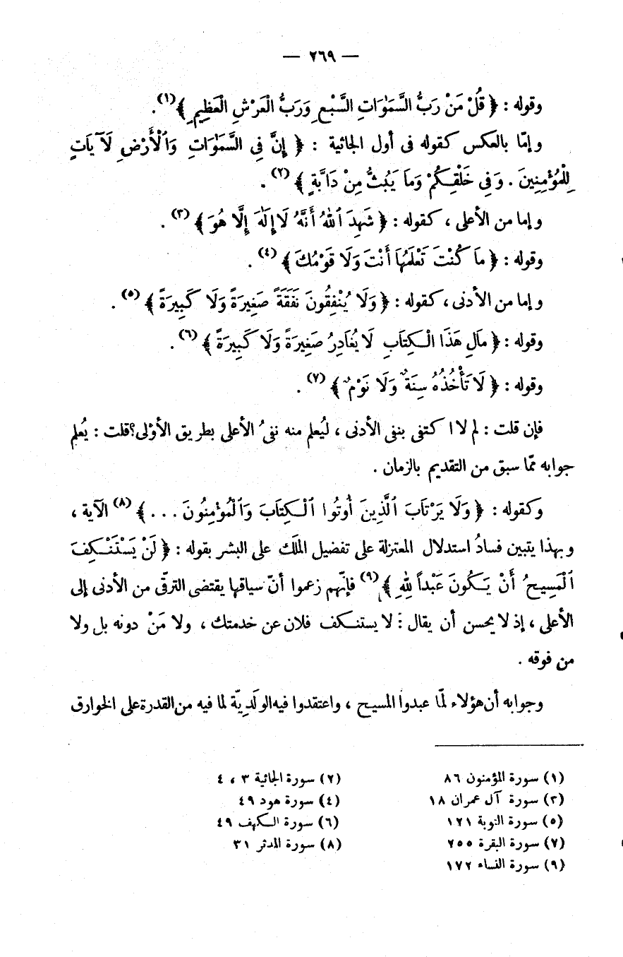 وَكَقَوْلِهِ: {ولا يرتاب الذين أوتوا الكتاب والمؤمنون} الْآيَةَ، وَبِهَذَا يَتَبَيَّنُ فَسَادُ اسْتِدْلَالِ الْمُعْتَزِلَةِ عَلَى تَفْضِيلِ الْمَلَكِ عَلَى الْبَشَرِ بِقَوْلِهِ: {لَنْ يَسْتَنْكِفَ المسيح أن يكون عبدا لله} فَإِنَّهُمْ زَعَمُوا أَنَّ سِيَاقَهَا يَقْتَضِي التَّرَقِّيَ مِنَ الْأَدْنَى إِلَى الْأَعْلَى إِذْ لَا يَحْسُنُ أَنْ يُقَالَ لَا يَسْتَنْكِفُ فُلَانٌ عَنْ خِدْمَتِكَ وَلَا مَنْ دُونَهُ بَلْ وَلَا مَنْ فَوْقَهُ.