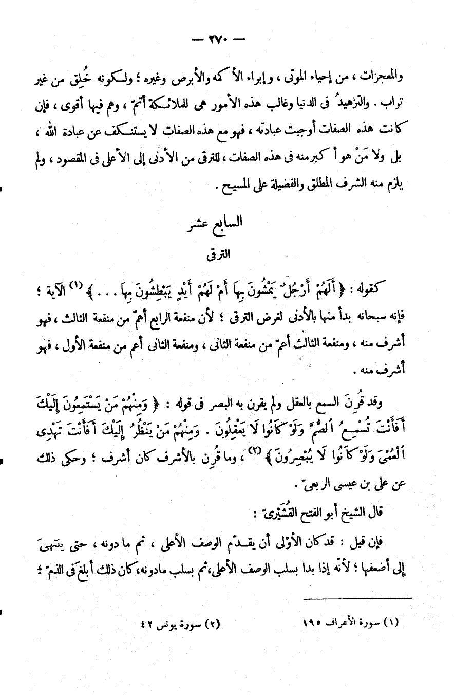 كقوله: {أَلَهُمْ أَرْجُلٌ يَمْشُونَ بِهَا أَمْ لَهُمْ أَيْدٍ يبطشون بها} الْآيَةَ، فَإِنَّهُ سُبْحَانَهُ بَدَأَ مِنْهَا بِالْأَدْنَى لِغَرَضِ الترقي لأن منفعة الرَّابِعِ أَهَمُّ مِنْ مَنْفَعَةِ الثَّالِثِ فَهُوَ أَشْرَفُ مِنْهُ وَمَنْفَعَةَ الثَّالِثِ أَعَمُّ مِنْ مَنْفَعَةِ الثَّانِي وَمَنْفَعَةَ الثَّانِي أَعَمُّ مِنْ مَنْفَعَةِ الْأَوَّلِ فَهُوَ أَشْرَفُ مِنْهُ.