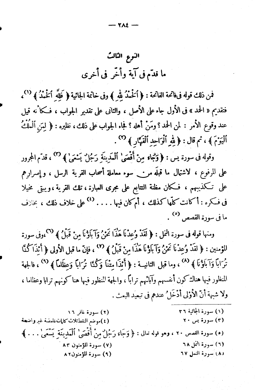 النَّوْعُ الثَّالِثُ: مَا قُدِّمَ فِي آيَةٍ وَأُخِّرَ فِي أُخْرَى.