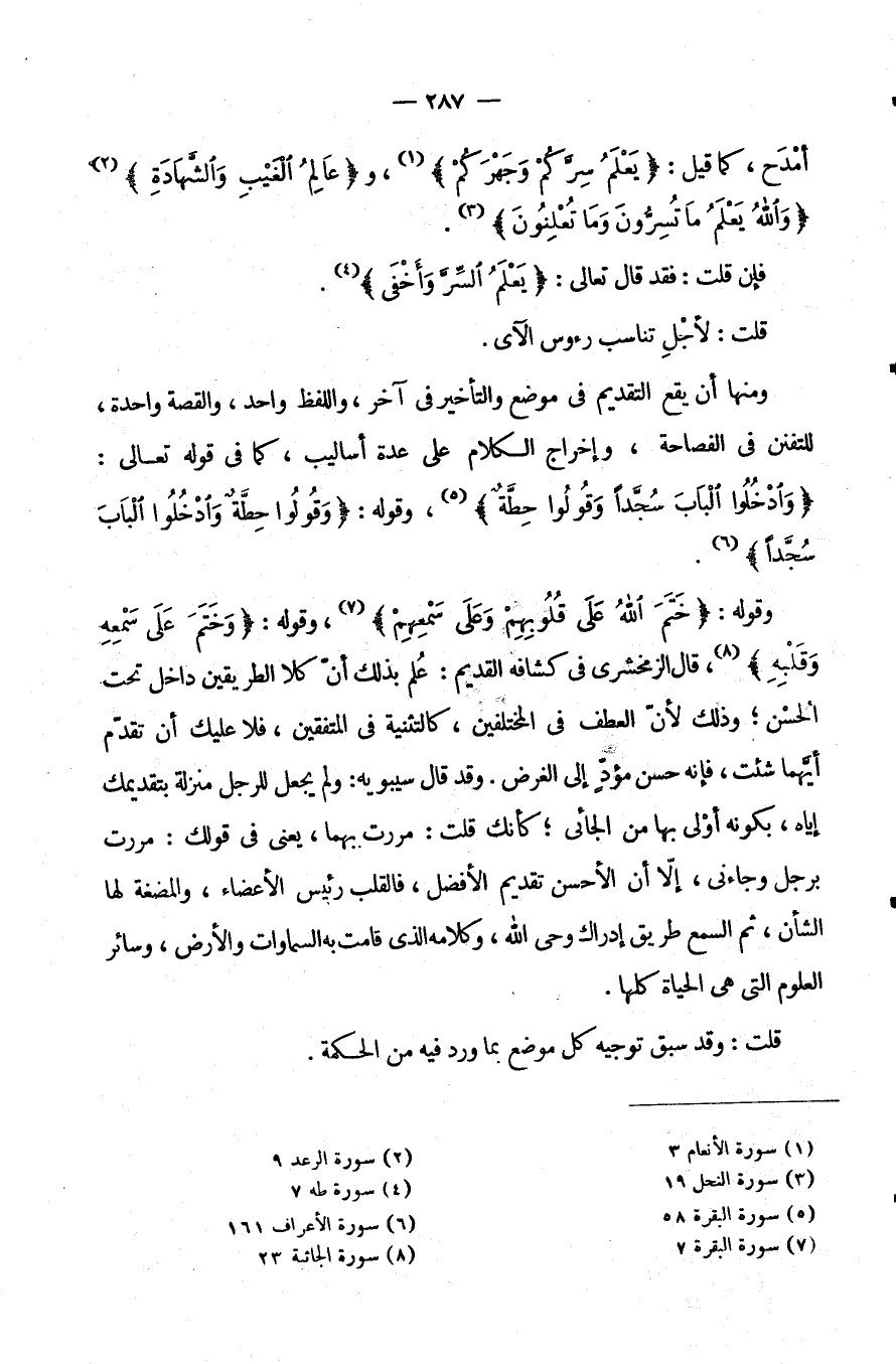 وَقَوْلِهِ: {خَتَمَ اللَّهُ عَلَى قُلُوبِهِمْ وَعَلَى سَمْعِهِمْ} وقوله: {وختم على سمعه وقلبه} قَالَ الزَّمَخْشَرِيُّ فِي كَشَّافِهِ الْقَدِيمِ عُلِمَ بِذَلِكَ أَنَّ كِلَا الطَّرِيقَيْنِ دَاخِلٌ تَحْتَ الْحُسْنِ وَذَلِكَ لِأَنَّ الْعَطْفَ فِي الْمُخْتَلِفَيْنِ كَالتَّثْنِيَةِ فِي الْمُتَّفِقَيْنِ فَلَا عَلَيْكَ أَنْ تُقَدِّمَ أَيَّهُمَا شِئْتَ فَإِنَّهُ حَسَنٌ مُؤَدٍّ إِلَى الْغَرَضِ. وَقَدْ قَالَ سِيبَوَيْهِ: وَلَمْ يُجْعَلْ لِلرَّجُلِ مَنْزِلَةً بِتَقْدِيمِكَ إِيَّاهُ بِكَوْنِهِ أَوْلَى بِهَا مِنَ الْجَائِي كَأَنَّكَ قُلْتَ: مَرَرْتُ بِهِمَا يَعْنِي فِي قَوْلِكَ مَرَرْتُ بِرَجُلٍ وَجَاءَنِي إِلَّا أَنَّ الْأَحْسَنَ تَقْدِيمُ الْأَفْضَلِ فَالْقَلْبُ رَئِيسُ الْأَعْضَاءِ وَالْمُضْغَةُ لَهَا الشَّأْنُ ثُمَّ السَّمْعُ طَرِيقُ إدرك وَحْيِ اللَّهِ وَكَلَامِهِ الَّذِي قَامَتْ بِهِ السَّمَاوَاتُ وَالْأَرْضُ وَسَائِرِ الْعُلُومِ الَّتِي هِيَ الْحَيَاةُ كُلُّهَا.