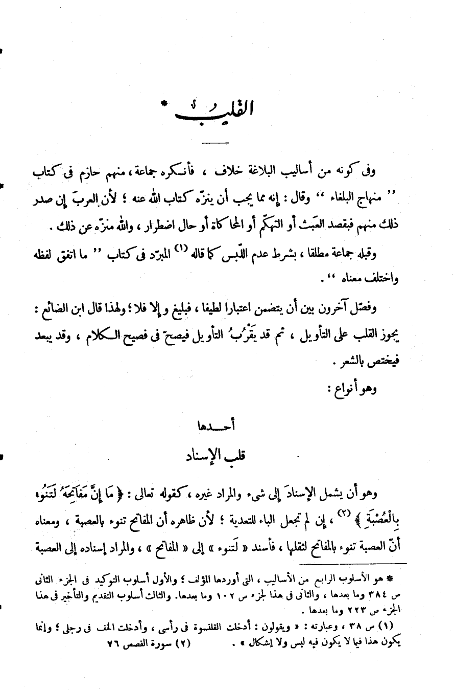 وَهُوَ أَنْ يَشْمَلَ الْإِسْنَادَ إِلَى شَيْءٍ وَالْمُرَادُ غَيْرُهُ كَقَوْلِهِ تَعَالَى: {مَا إِنَّ مَفَاتِحَهُ لَتَنُوءُ بِالْعُصْبَةِ} إِنْ لَمْ تَجْعَلِ الْبَاءَ لِلتَّعْدِيَةِ لِأَنَّ ظَاهِرَهُ أَنَّ الْمَفَاتِحَ تَنُوءُ بِالْعُصْبَةِ وَمَعْنَاهُ أَنَّ الْعُصْبَةَ تَنُوءُ بِالْمَفَاتِحِ لِثِقَلِهَا فَأَسْنَدَ " لَتَنُوءُ " إِلَى "الْمَفَاتِحِ" وَالْمُرَادُ إِسْنَادُهُ إِلَى الْعُصْبَةِ.