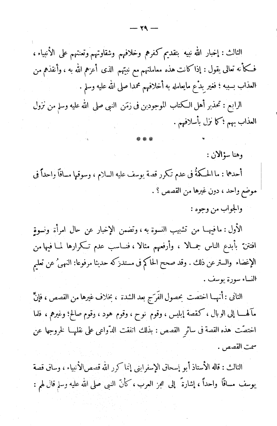 أَحَدُهُمَا مَا الْحِكْمَةُ فِي عَدَمِ تَكَرُّرِ قِصَّةِ يُوسُفَ عَلَيْهِ السَّلَامُ وَسَوْقُهَا مَسَاقًا وَاحِدًا فِي مَوْضِعٍ وَاحِدٍ دُونَ غَيْرِهَا مِنَ الْقِصَصِ