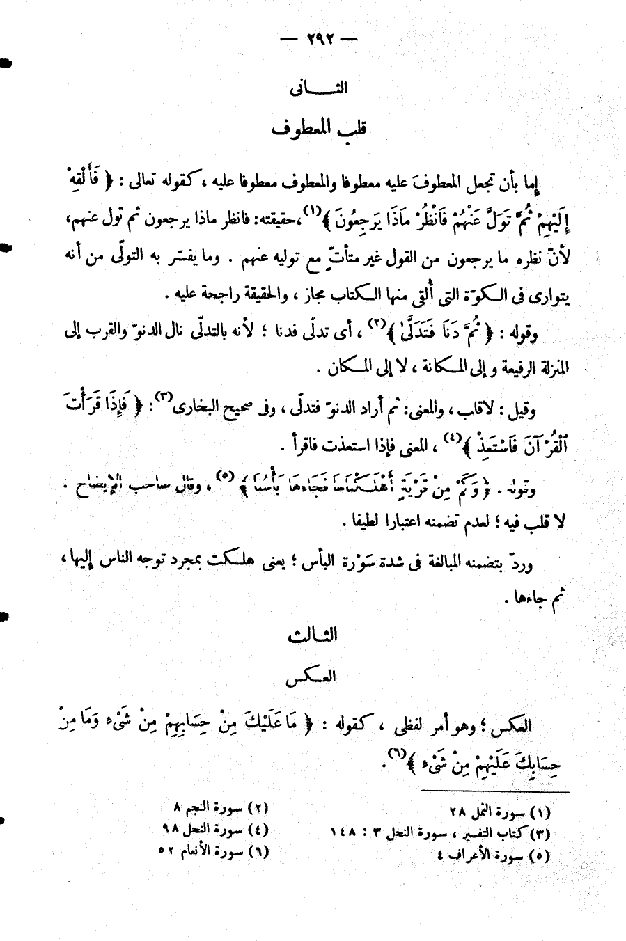 إما بأن تجعل الْمَعْطُوفُ عَلَيْهِ مَعْطُوفًا وَالْمَعْطُوفُ مَعْطُوفًا عَلَيْهِ كَقَوْلِهِ تَعَالَى: {فَأَلْقِهِ إِلَيْهِمْ ثُمَّ تَوَلَّ عَنْهُمْ فَانْظُرْ ماذا يرجعون} ، حَقِيقَتُهُ فَانْظُرْ مَاذَا يَرْجِعُونَ ثُمَّ تَوَلَّ عَنْهُمْ لأنه نَظَرَهُ مَا يَرْجِعُونَ مِنَ الْقَوْلِ غَيْرُ مُتَأَتٍّ مَعَ تَوَلِّيهِ عَنْهُمْ. وَمَا يُفَسَّرُ بِهِ التَّوَلِّي مِنْ أَنَّهُ يَتَوَارَى فِي الْكُوَّةِ الَّتِي أَلْقَى مِنْهَا الْكِتَابَ مَجَازٌ وَالْحَقِيقَةُ رَاجِحَةٌ عَلَيْهِ.