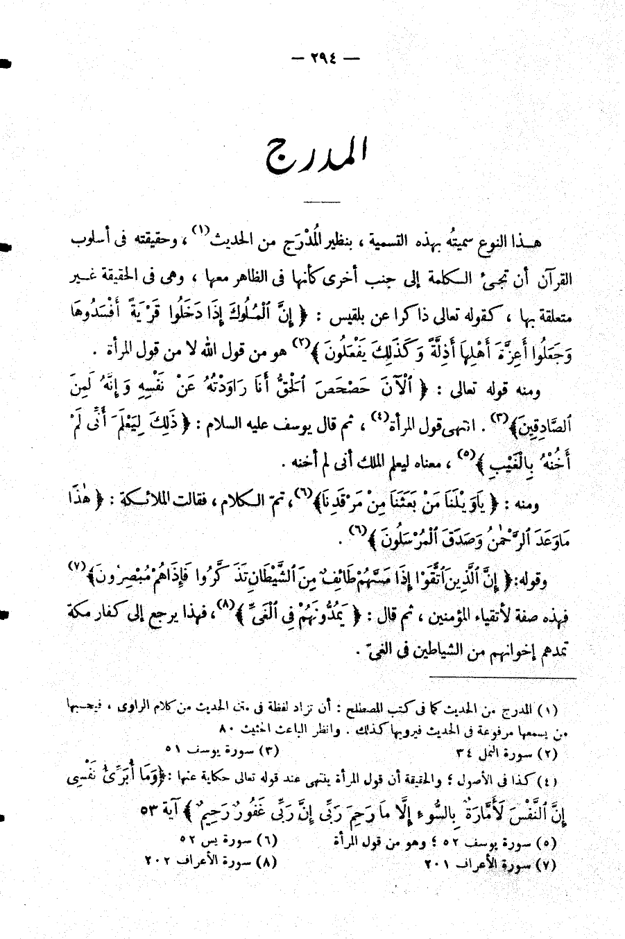 هَذَا النَّوْعُ سَمَّيْتُهُ بِهَذِهِ التَّسْمِيَةِ بِنَظِيرِ الْمُدْرَجِ مِنَ الْحَدِيثِ وَحَقِيقَتُهُ فِي أُسْلُوبِ الْقُرْآنِ أَنْ تَجِيءَ الْكَلِمَةُ إِلَى جَنْبِ أُخْرَى كَأَنَّهَا فِي الظَّاهِرِ مَعَهَا وَهِيَ فِي الْحَقِيقَةِ غَيْرُ مُتَعَلِّقَةٍ بِهَا كَقَوْلِهِ تَعَالَى ذَاكِرًا عَنْ بِلْقِيسَ: {إِنَّ الْمُلُوكَ إِذَا دَخَلُوا قَرْيَةً أَفْسَدُوهَا وَجَعَلُوا أعزة أهلها أذلة وَكَذَلِكَ يَفْعَلُونَ} هُوَ مِنْ قَوْلِ اللَّهِ لَا مِنْ قَوْلِ الْمَرْأَةِ.