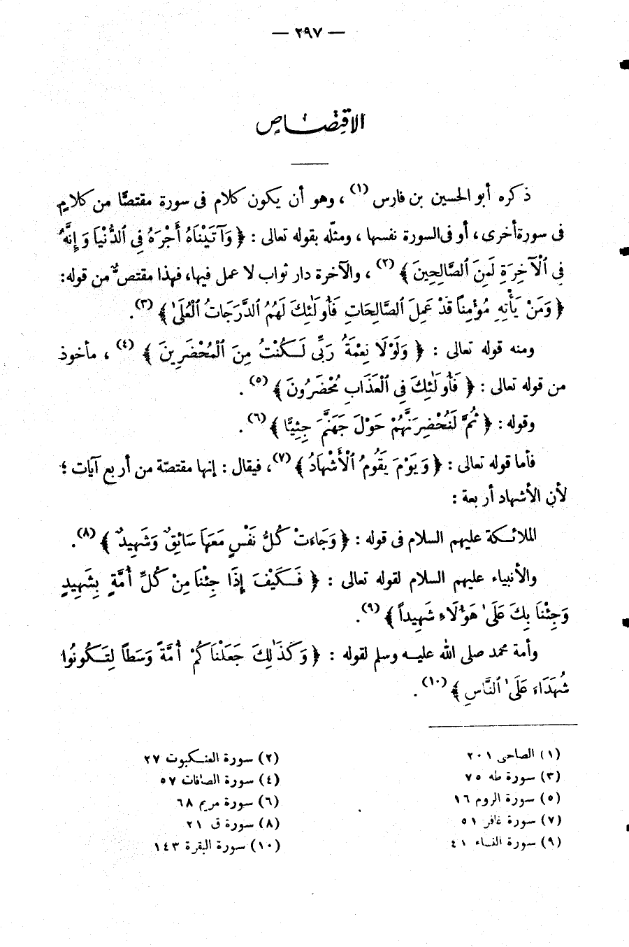 ذَكَرَهُ أَبُو الْحُسَيْنِ بْنُ فَارِسٍ وَهُوَ أَنْ يَكُونَ كَلَامٌ فِي سُورَةٍ مُقْتَصًّا مِنْ كَلَامٍ فِي سُورَةٍ أُخْرَى أَوْ فِي السُّورَةِ نَفْسِهَا وَمَثَّلَهُ بِقَوْلِهِ تَعَالَى: {وَآتَيْنَاهُ أَجْرَهُ فِي الدنيا وإنه في الآخرة لمن الصالحين} ، وَالْآخِرَةُ دَارُ ثَوَابٍ لَا عَمَلَ فِيهَا فَهَذَا مُقْتَصٌّ مِنْ قَوْلِهِ: {وَمَنْ يَأْتِهِ مُؤْمِنًا قَدْ عمل الصالحات فأولئك لهم الدرجات العلى} .