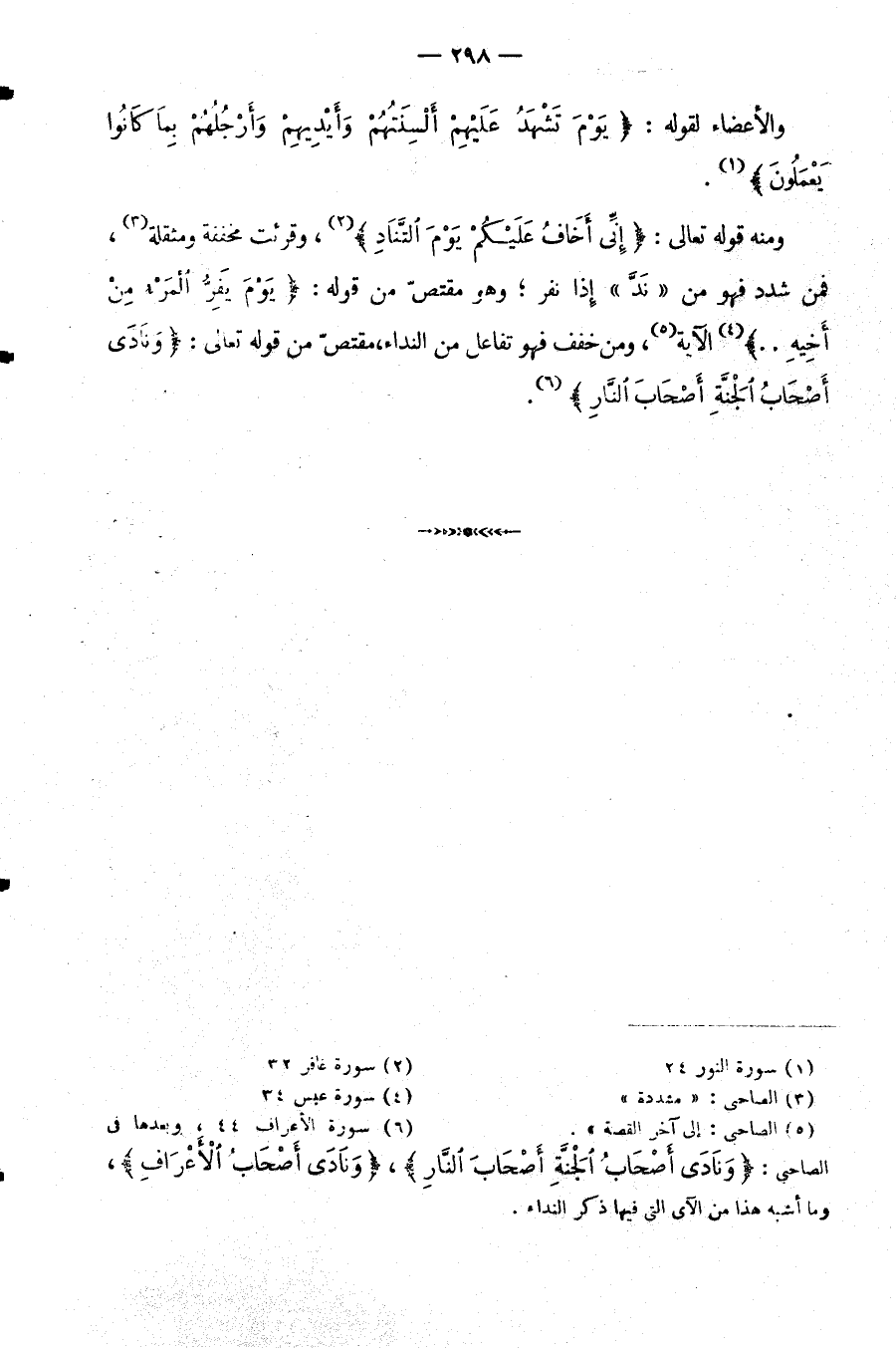 وَمِنْهُ قَوْلُهُ تَعَالَى: {إِنِّي أَخَافُ عَلَيْكُمْ يَوْمَ التناد} وَقُرِئَتْ مُخَفَّفَةً وَمُثَقَّلَةً فَمَنْ شَدَّدَ فَهُوَ مِنْ [نَدَّ] إِذَا نَفَرَ وَهُوَ مُقْتَصٌّ مِنْ قَوْلِهِ: {يوم يفر المرء من أخيه} الْآيَةَ. وَمَنْ خَفَّفَ فَهُوَ تَفَاعُلٌ مِنَ النِّدَاءِ مُقْتَصٌّ مِنْ قَوْلِهِ تَعَالَى: {وَنَادَى أَصْحَابُ الْجَنَّةِ أصحاب النار} .