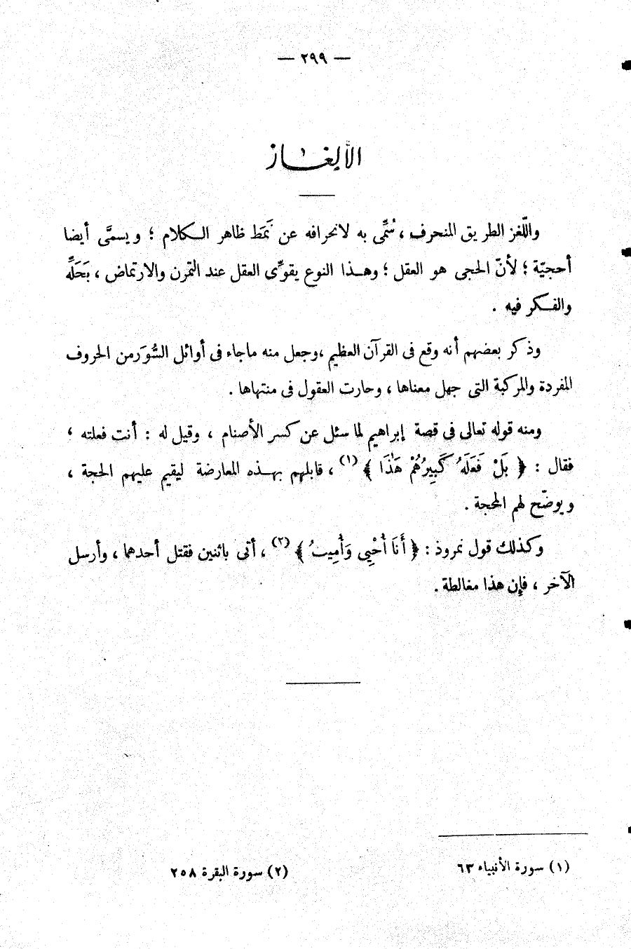 وَاللُّغْزُ الطَّرِيقُ الْمُنْحَرِفُ سُمِّيَ بِهِ لِانْحِرَافِهِ عَنْ نَمَطِ ظَاهِرِ الْكَلَامِ وَيُسَمَّى أَيْضًا أُحْجِيَّةً لأن الحجى هُوَ الْعَقْلُ وَهَذَا النَّوْعُ يُقَوِّي الْعَقْلَ عِنْدَ التمرن والارتماض بِحَلِّهِ وَالْفِكْرِ فِيهِ.