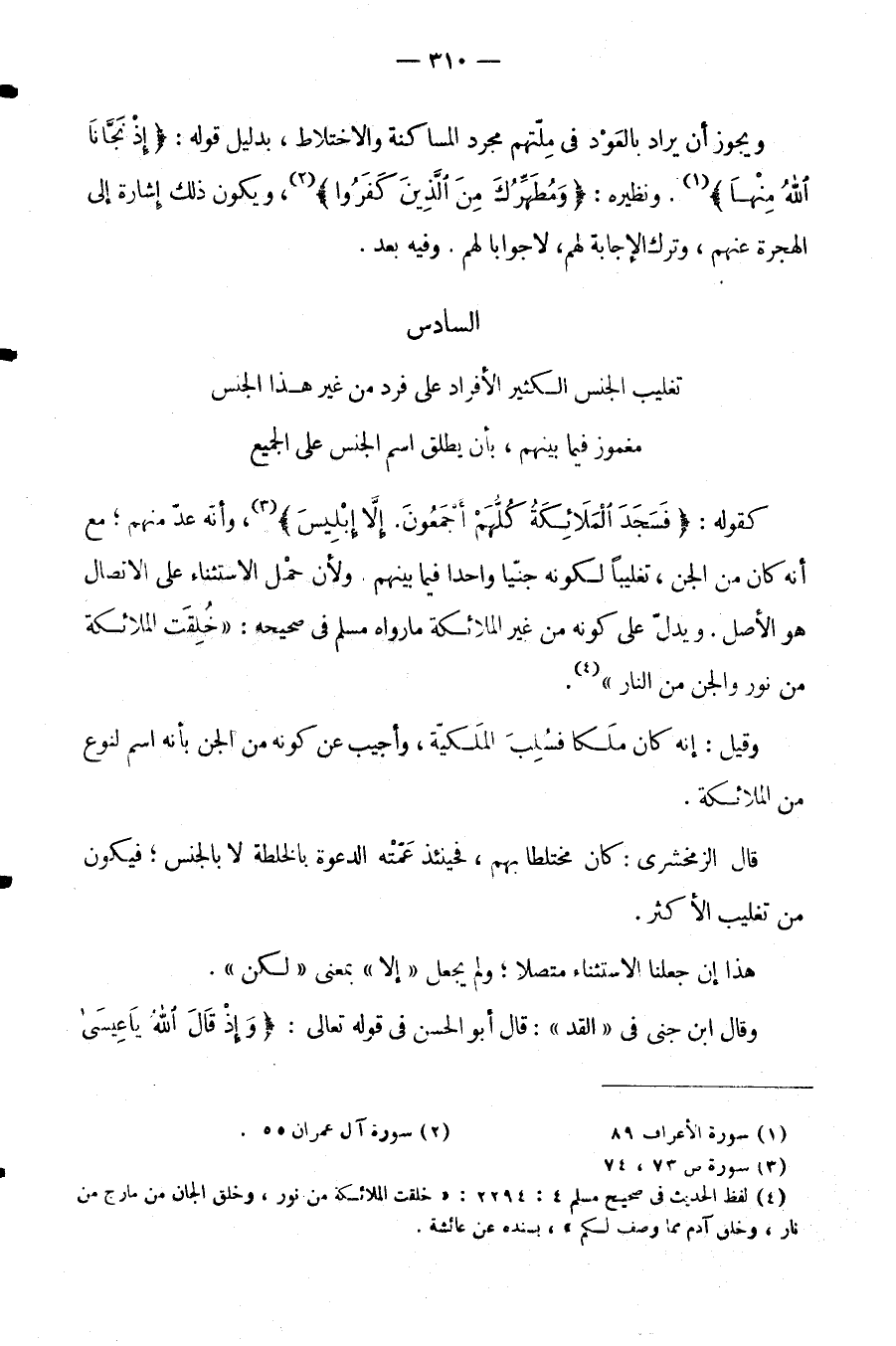 كَقَوْلِهِ: {فسجد الملائكة كلهم أجمعون إلا إبليس} وَأَنَّهُ عُدَّ مِنْهُمْ مَعَ أَنَّهُ كَانَ مِنَ الْجِنِّ تَغْلِيبًا لِكَوْنِهِ جِنِّيًّا وَاحِدًا فِيمَا بَيْنَهُمْ وَلِأَنَّ حَمْلَ الِاسْتِثْنَاءِ عَلَى الِاتِّصَالِ هُوَ الْأَصْلُ. وَيَدُلُّ عَلَى كَوْنِهِ مِنْ غَيْرِ الْمَلَائِكَةِ مَا رَوَاهُ مُسْلِمٌ فِي صَحِيحِهِ: " خُلِقَتِ الْمَلَائِكَةُ مِنْ نُورٍ وَالْجِنُّ مِنَ النَّارِ ".