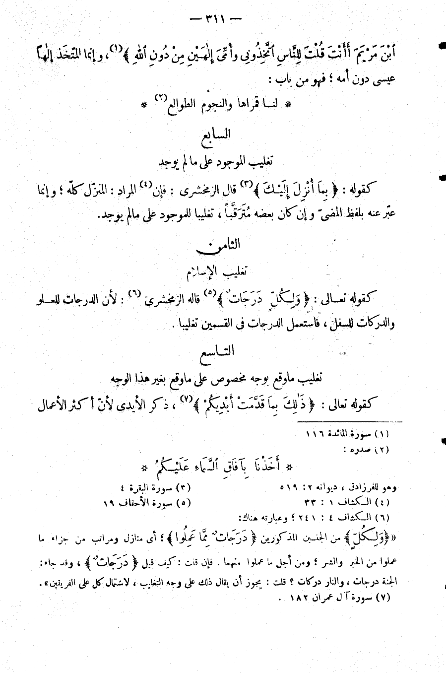 كَقَوْلِهِ تَعَالَى: {وَلِكُلٍّ دَرَجَاتٌ} قاله الزَّمَخْشَرِيُّ: لِأَنَّ الدَّرَجَاتِ لِلْعُلُوِّ وَالدَّرَكَاتِ لِلسُّفْلِ فَاسْتُعْمِلَ الدَّرَجَاتُ فِي الْقِسْمَيْنِ تَغْلِيبًا.