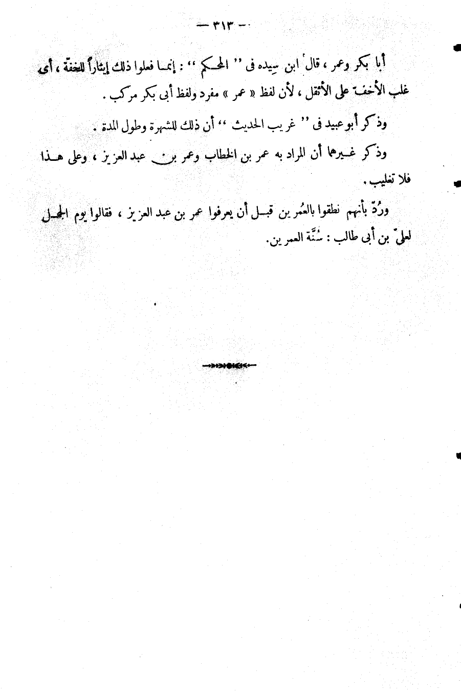 أَبَا بَكْرٍ وَعُمَرَ قَالَ ابْنُ سِيدَهْ فِي "الْمُحْكَمِ": إِنَّمَا فَعَلُوا ذَلِكَ إِيثَارًا لِلْخِفَّةِ أَيْ غُلِّبَ الْأَخَفُّ عَلَى الْأَثْقَلِ لِأَنَّ لَفْظَ [عُمَرَ] مُفْرَدٌ وَلَفْظَ أَبِي بَكْرٍ مُرَكَّبٌ.
