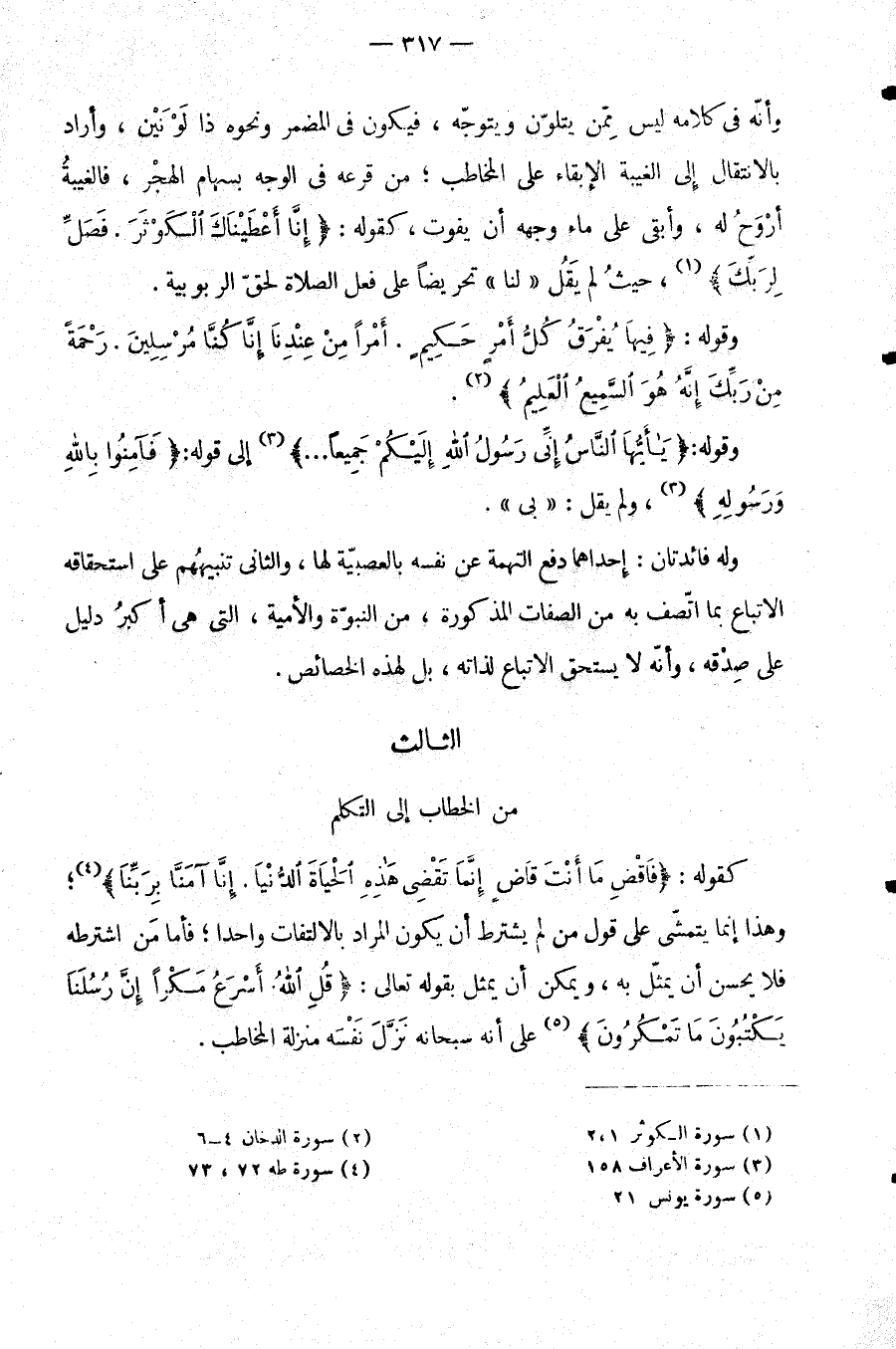 وَأَنَّهُ فِي كَلَامِهِ لَيْسَ مِمَّنْ يَتَلَوَّنُ وَيَتَوَجَّهُ فَيَكُونُ فِي الْمُضْمَرِ وَنَحْوِهِ ذَا لَوْنَيْنِ وَأَرَادَ بِالِانْتِقَالِ إِلَى الْغَيْبَةِ الْإِبْقَاءَ عَلَى الْمُخَاطَبِ مِنْ قَرْعِهِ فِي الْوَجْهِ بِسِهَامِ الْهَجْرِ فَالْغِيبَةُ أَرْوَحُ لَهُ وَأَبْقَى عَلَى مَاءِ وَجْهِهِ أَنْ يَفُوتَ كقوله: {إنا أعطيناك الكوثر فصل لربك} حَيْثُ لَمْ يَقُلْ: [لَنَا] تَحْرِيضًا عَلَى فِعْلِ الصَّلَاةِ لِحَقِّ الرُّبُوبِيَّةِ.