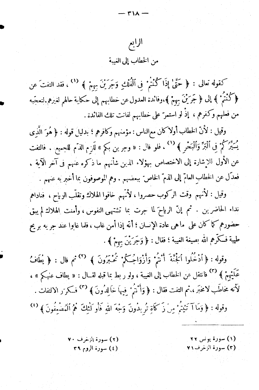كَقَوْلِهِ تَعَالَى: {حَتَّى إِذَا كُنْتُمْ فِي الْفُلْكِ وَجَرَيْنَ بِهِمْ} فقد التفت عن {كنتم} إلى {جرين بهم} وَفَائِدَةُ الْعُدُولِ عَنْ خِطَابِهِمْ إِلَى حِكَايَةِ حَالِهِمْ لِغَيْرِهِمْ لِتَعَجُّبِهِ مِنْ فِعْلِهِمْ وَكُفْرِهِمْ إِذْ لَوِ استمر علىخطابهم لَفَاتَتْ تِلْكَ الْفَائِدَةُ.