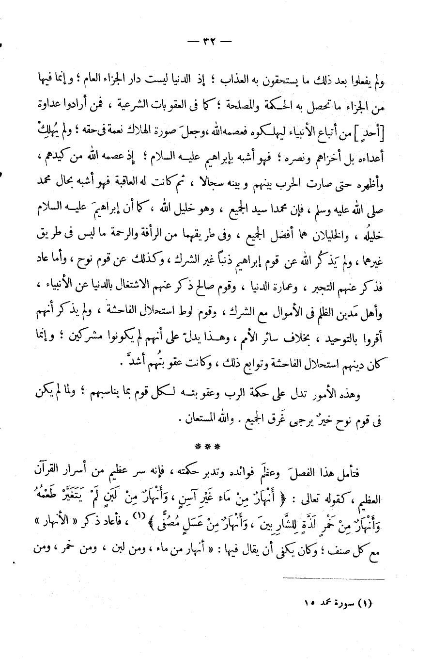 فَتَأَمَّلْ هَذَا الْفَصْلَ وَعَظِّمْ فَوَائِدَهُ وَتَدَبَّرْ حِكْمَتَهُ فَإِنَّهُ سِرٌّ عَظِيمٌ مِنْ أَسْرَارِ الْقُرْآنِ الْعَظِيمِ كَقَوْلِهِ تَعَالَى: {أَنْهَارٌ مِنْ مَاءٍ غَيْرِ آسِنٍ وَأَنْهَارٌ مِنْ لَبَنٍ لَمْ يَتَغَيَّرْ طَعْمُهُ وَأَنْهَارٌ مِنْ خَمْرٍ لَذَّةٍ لِلشَّارِبِينَ وَأَنْهَارٌ مِنْ عَسَلٍ مُصَفًّى} ، فَأَعَادَ ذِكْرَ الْأَنْهَارِ مَعَ كُلِّ صِنْفٍ، وَكَانَ يَكْفِي أَنْ يُقَالَ فِيهَا: أَنْهَارٌ مِنْ مَاءٍ، وَمِنْ لَبَنٍ، وَمَنْ خَمْرٍ، وَمِنْ.