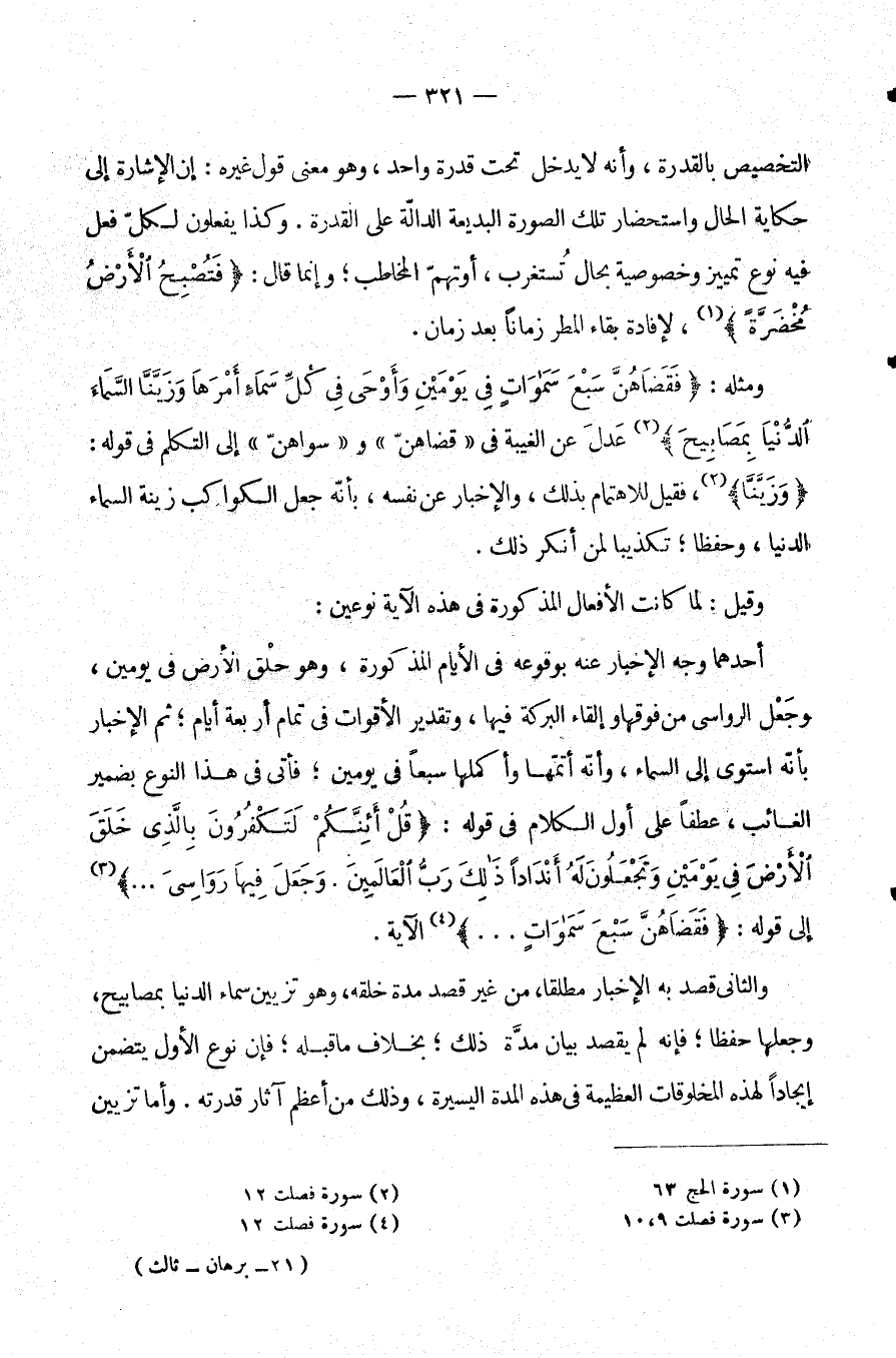 أَحَدُهُمَا: وَجْهُ الْإِخْبَارِ عَنْهُ بِوُقُوعِهِ فِي الْأَيَّامِ الْمَذْكُورَةِ وَهُوَ خَلْقُ الْأَرْضِ فِي يَوْمَيْنِ وَجَعْلُ الرَّوَاسِي مِنْ فَوْقِهَا وَإِلْقَاءُ الْبَرَكَةِ فِيهَا وَتَقْدِيرُ الْأَقْوَاتِ فِي تَمَامِ أَرْبَعَةِ أَيَّامٍ ثُمَّ الْإِخْبَارُ بِأَنَّهُ اسْتَوَى إِلَى السَّمَاءِ وَأَنَّهُ أَتَمَّهَا وَأَكْمَلَهَا سَبْعًا فِي يَوْمَيْنِ فَأَتَى فِي هَذَا النَّوْعِ بِضَمِيرِ الْغَائِبِ عَطْفًا عَلَى أَوَّلِ الْكَلَامِ فِي قَوْلِهِ: {قُلْ أإنكم لَتَكْفُرُونَ بِالَّذِي خَلَقَ الْأَرْضَ فِي يَوْمَيْنِ وَتَجْعَلُونَ لَهُ أَنْدَادًا ذَلِكَ رَبُّ الْعَالَمِينَ وَجَعَلَ فِيهَا رواسي} إلى قوله: {فقضاهن سبع سماوات} الْآيَةَ.