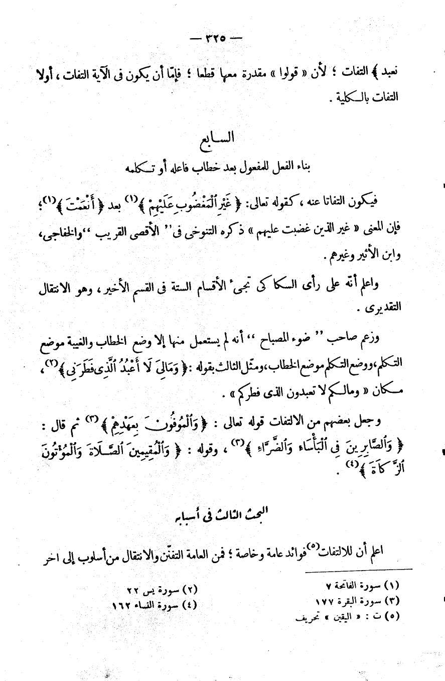 فَيَكُونُ الْتِفَاتًا عَنْهُ كَقَوْلِهِ تَعَالَى: {غَيْرِ الْمَغْضُوبِ عَلَيْهِمْ} بعد {أنعمت} فَإِنَّ الْمَعْنَى: غَيْرِ الَّذِينَ غَضِبْتَ عَلَيْهِمْ. ذَكَرَهُ التَّنُوخِيُّ فِي "الْأَقْصَى الْقَرِيبِ" وَالْخَفَاجِيُّ وَابْنُ الْأَثِيرِ وَغَيْرُهُمْ.